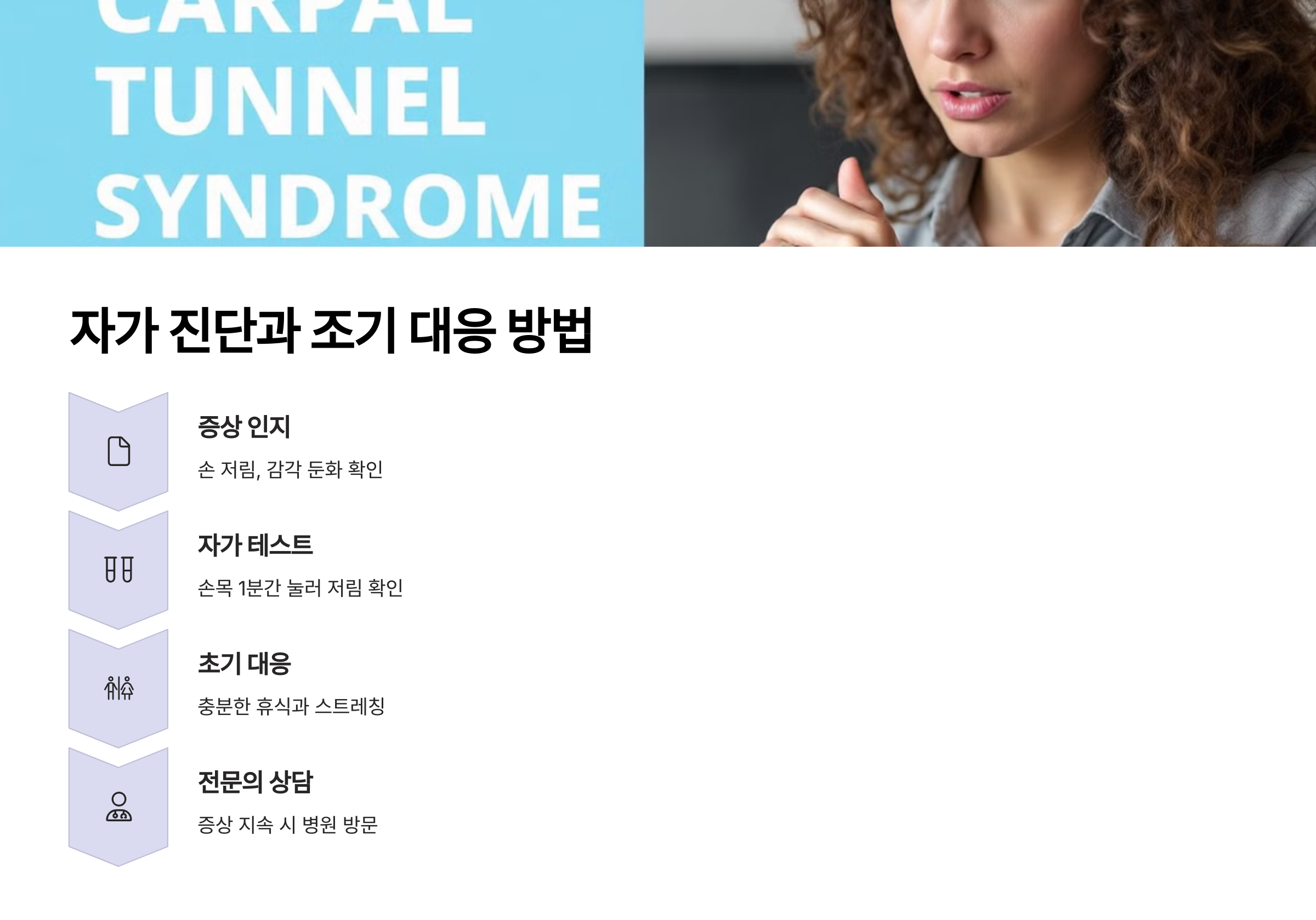 만약 손이 저리거나 손끝 감각이 둔해지는 느낌이 있다면 손목터널증후군을 의심해볼 필요가 있어요. 간단한 자가 테스트로는 '팔을 구부린 상태에서 손목을 1분간 눌렀을 때 저림이 오는지'를 확인하는 방법이 있습니다. 증상이 지속된다면 빠른시일내에 전문의 상담이 필요합니다.