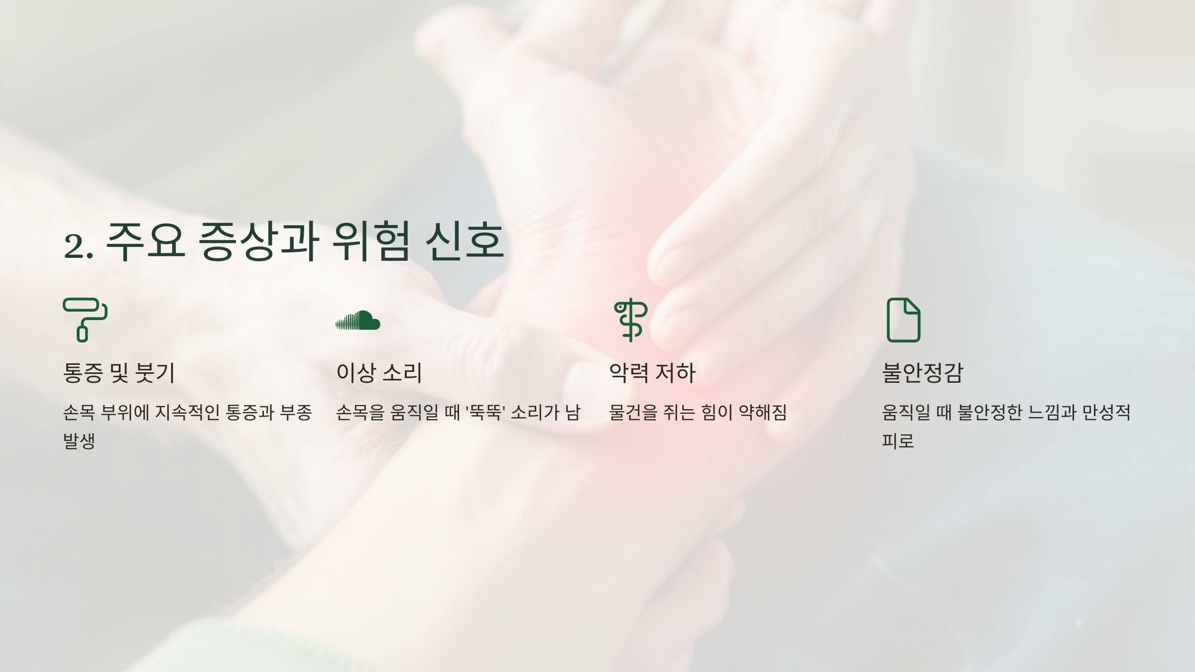 - 손목 부위 통증 및 붓기