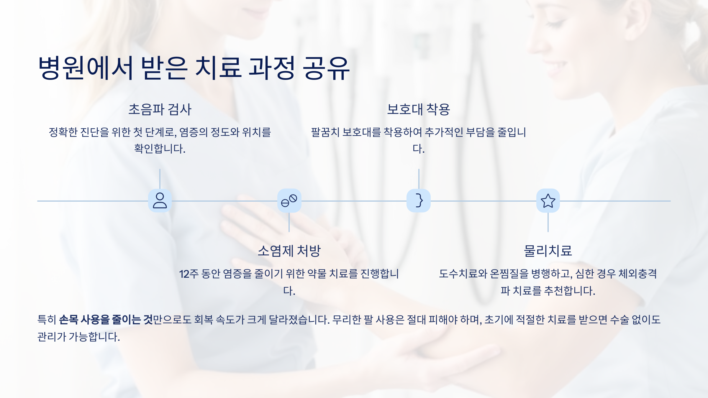 특히 손목 사용을 줄이는 것만으로도 회복 속도가 달라졌어요! 무리한 팔 사용은 절대 피해야 합니다.