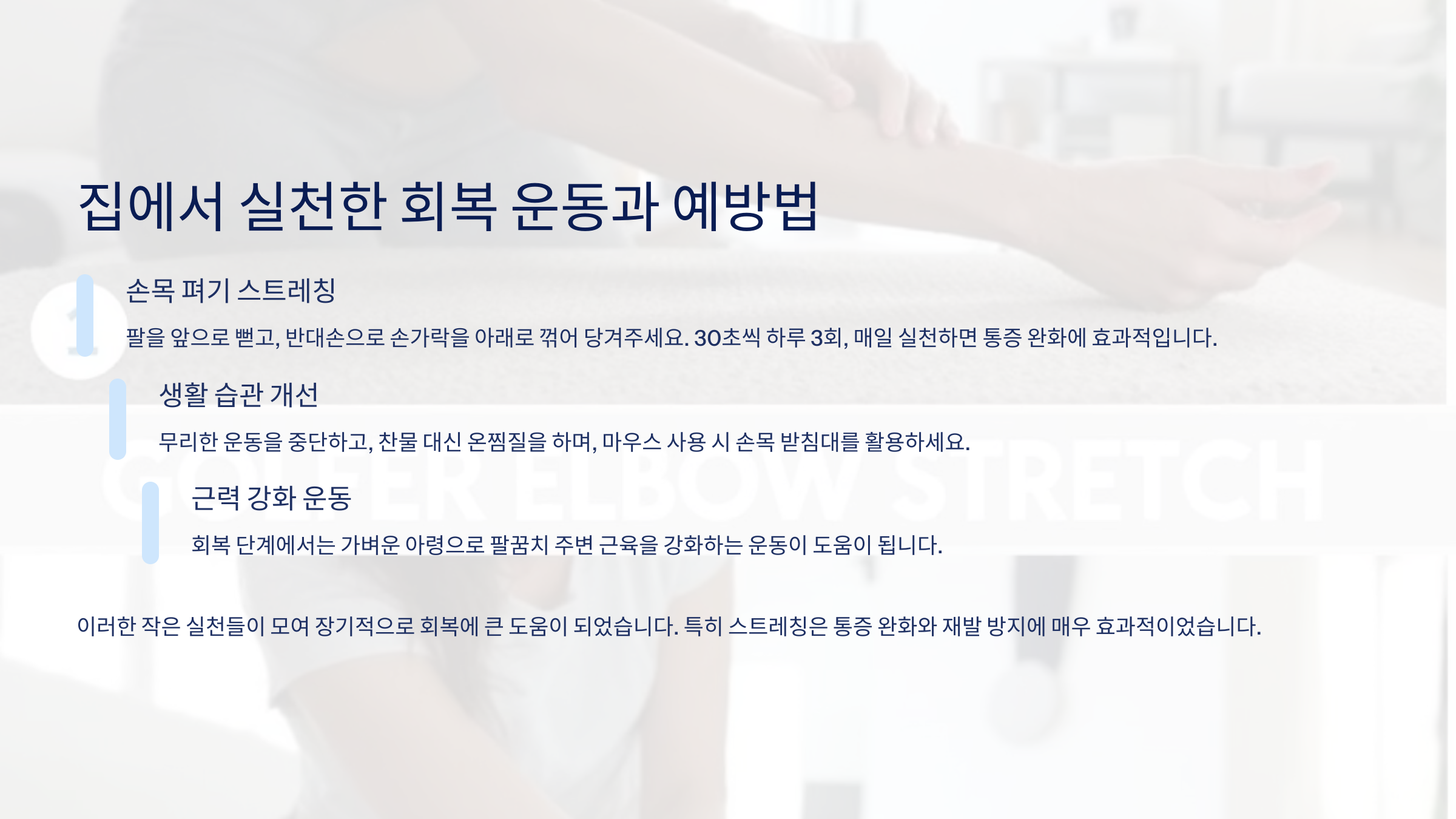 통증이 사라진 지금은 오히려 자세에 더 신경 쓰게 되었고, 운동 전 스트레칭을 철저히 하게 됐어요. 여러분도 팔꿈치 통증이 있다면, 오늘 바로 체크해보세요!