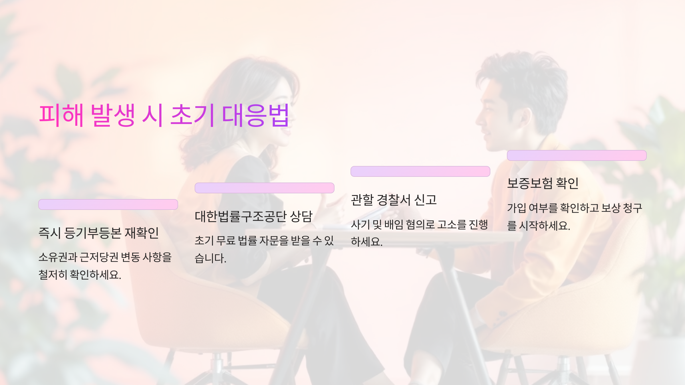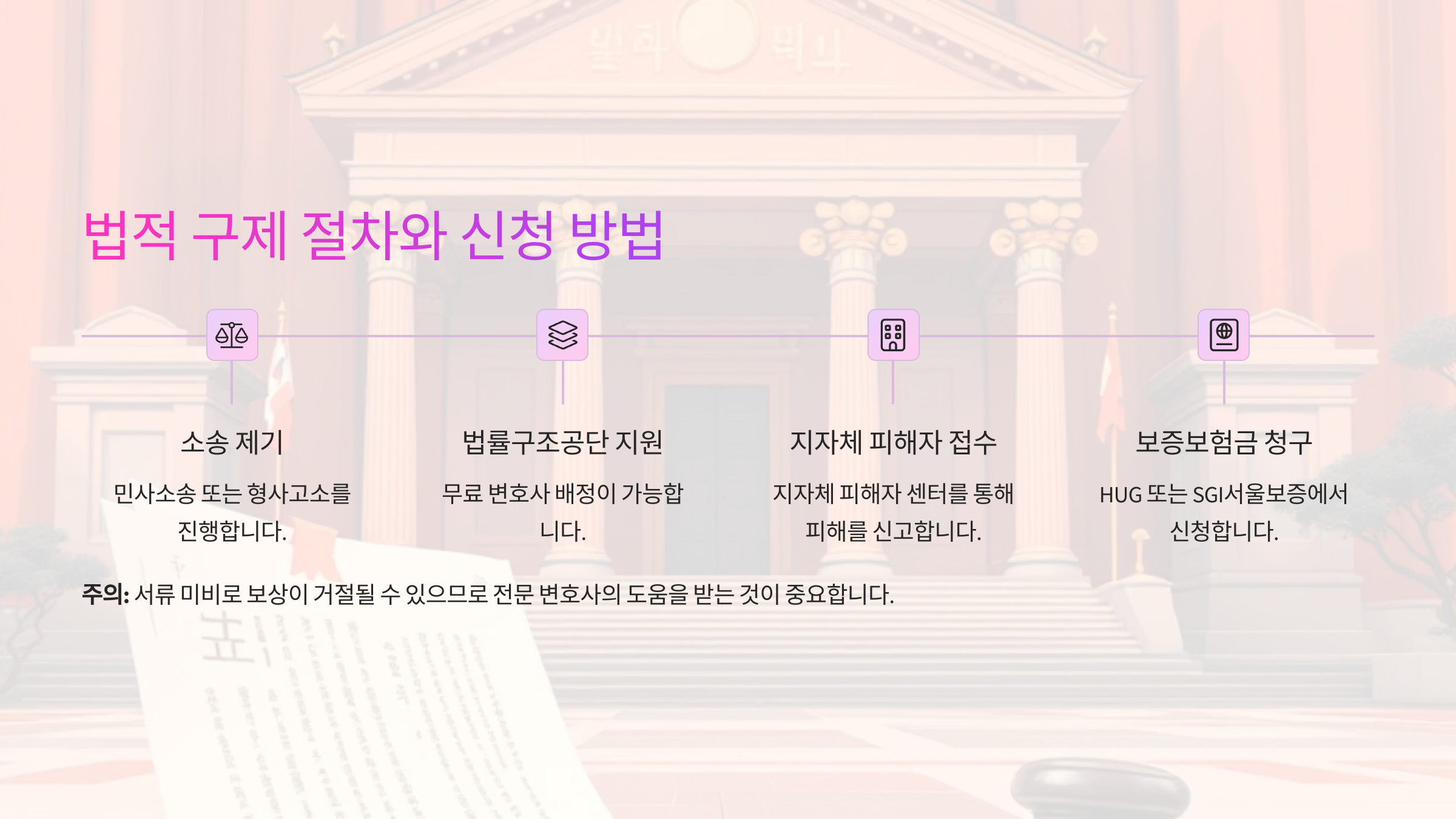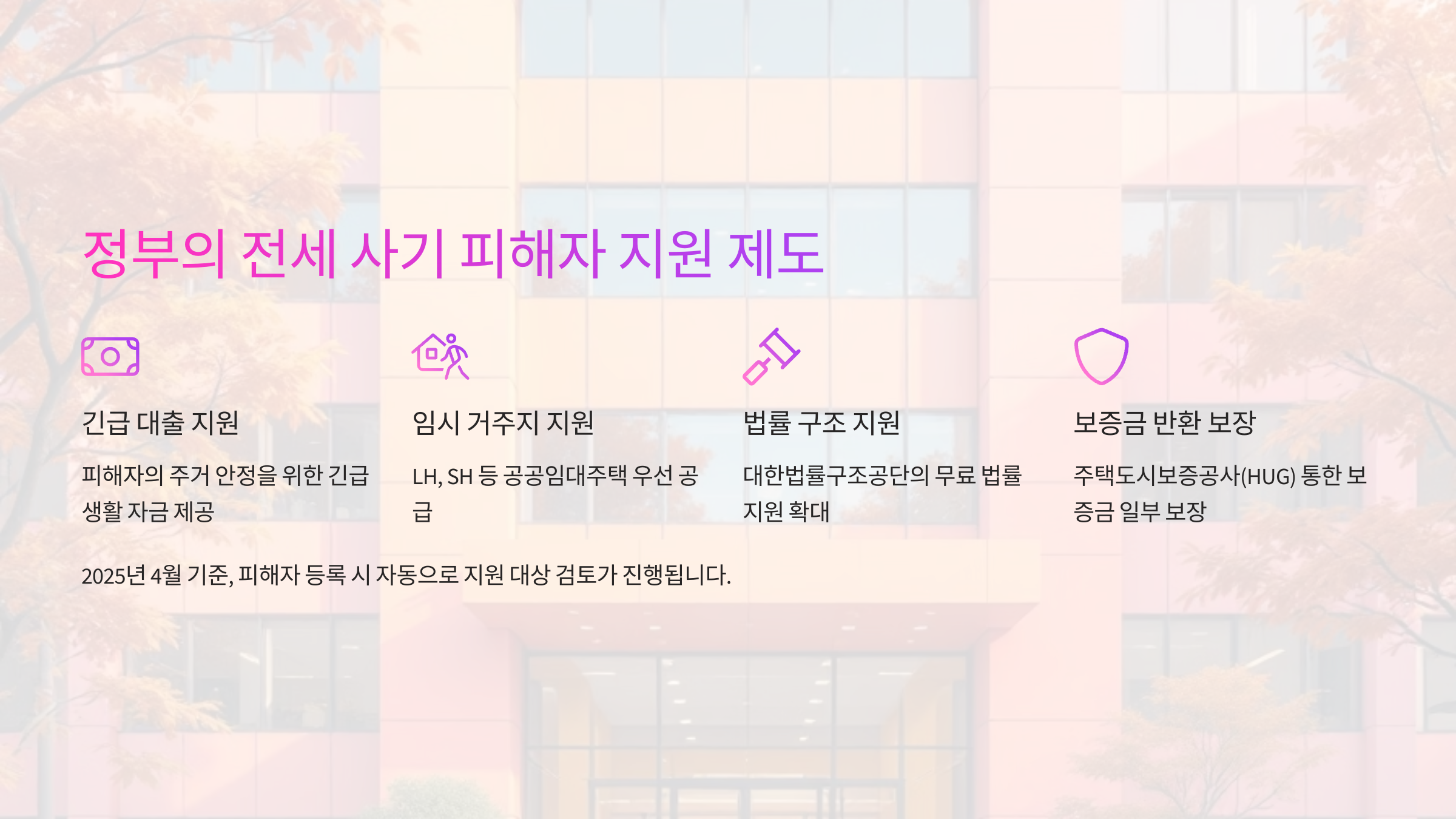 - 긴급 대출 지원: 피해자의 주거 안정을 위한 긴급 생활 자금 제공