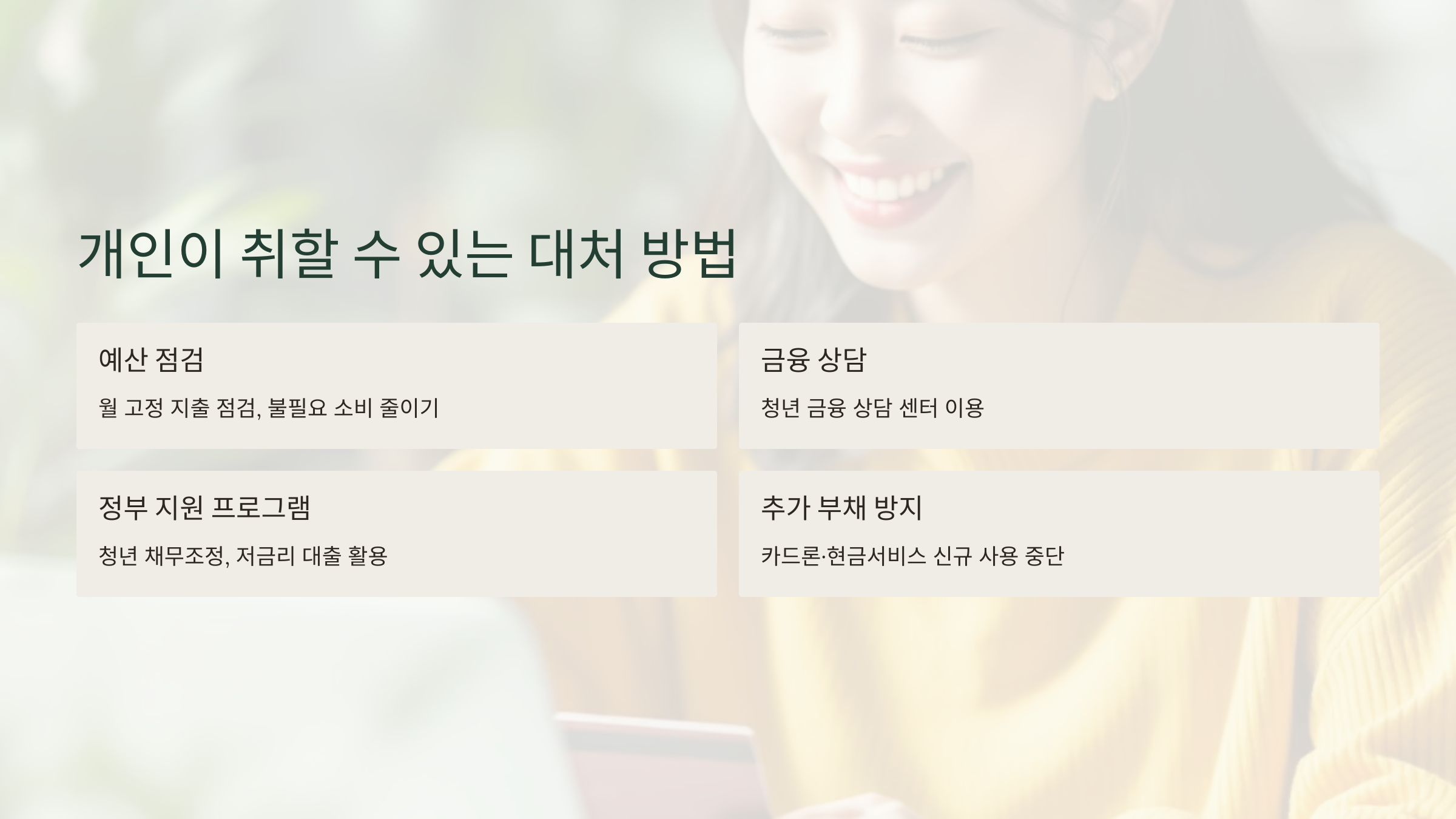 🔹 정부 지원 프로그램 활용: 청년 채무조정, 전세자금 저금리 대출 활용