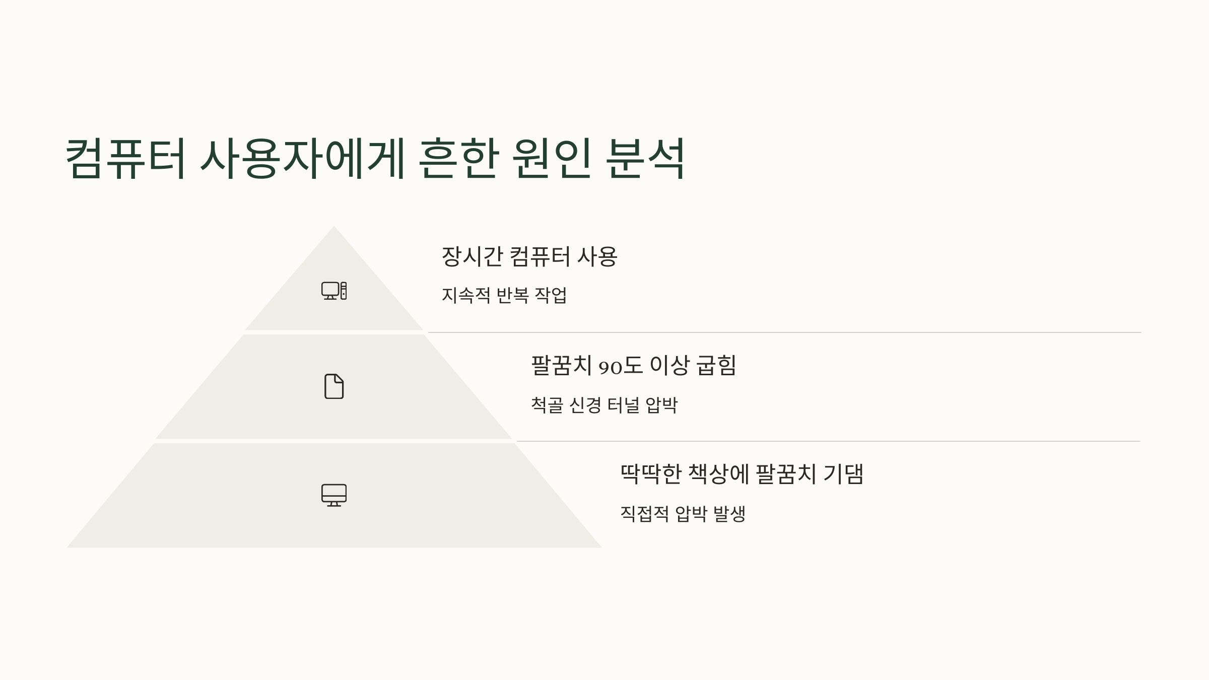컴퓨터 사용자는 팔꿈치를 90도 이상 굽히고 있는 시간이 굉장히 많아요. 이 자세가 척골 신경이 지나가는 '팔꿈치 터널'에 압박을 주는 가장 큰 원인이에요. 또, 팔꿈치를 딱딱한 책상 모서리에 계속 기대는 습관도 문제예요. 제 경우엔 마우스를 사용할 때 팔꿈치를 책상에 완전히 고정하고 있어서, 무의식 중에 압박이 계속되고 있었더라구요 🧠