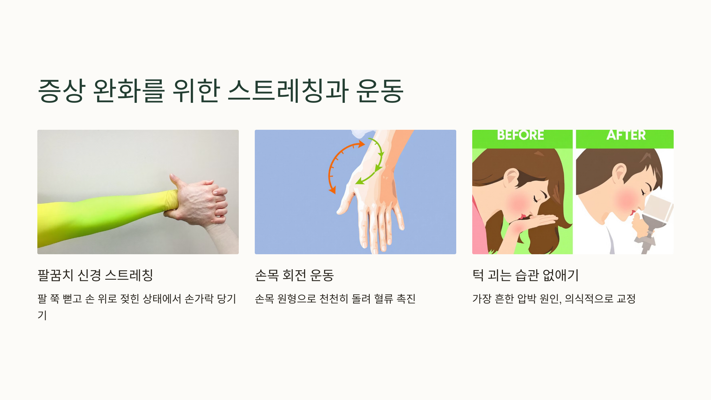 가벼운 증상이라면 스트레칭으로도 완화돼요. 하지만 심한 경우 병원 진단이 필요해요.