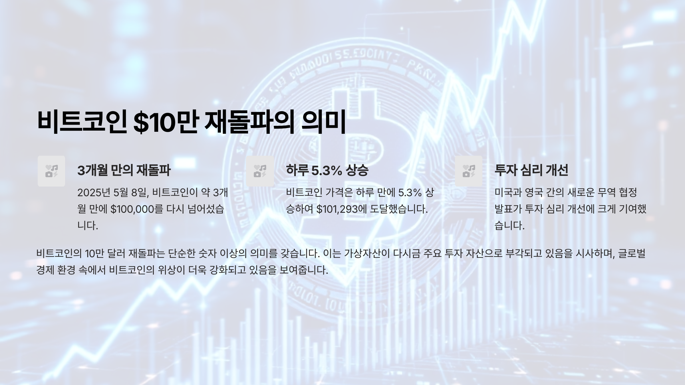 비트코인이 2025년 5월 8일, 약 3개월 만에 $100,000를 재돌파하며 시장의 주목을 받았습니다. 이는 미국과 영국 간의 새로운 무역 협정 발표에 따른 투자 심리 개선의 결과로, 비트코인 가격은 하루 만에 5.3% 상승하여 $101,293에 도달했습니다. 이러한 상승은 비트코인이 다시금 주요 투자 자산으로 부각되고 있음을 시사합니다.