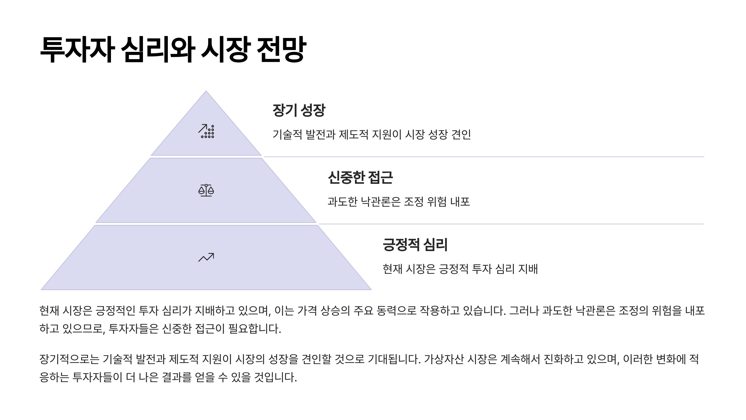 현재 시장은 긍정적인 투자 심리가 지배하고 있으며, 이는 가격 상승의 주요 동력으로 작용하고 있습니다. 그러나 과도한 낙관론은 조정의 위험을 내포하고 있으므로, 투자자들은 신중한 접근이 필요합니다. 장기적으로는 기술적 발전과 제도적 지원이 시장의 성장을 견인할 것으로 기대됩니다.