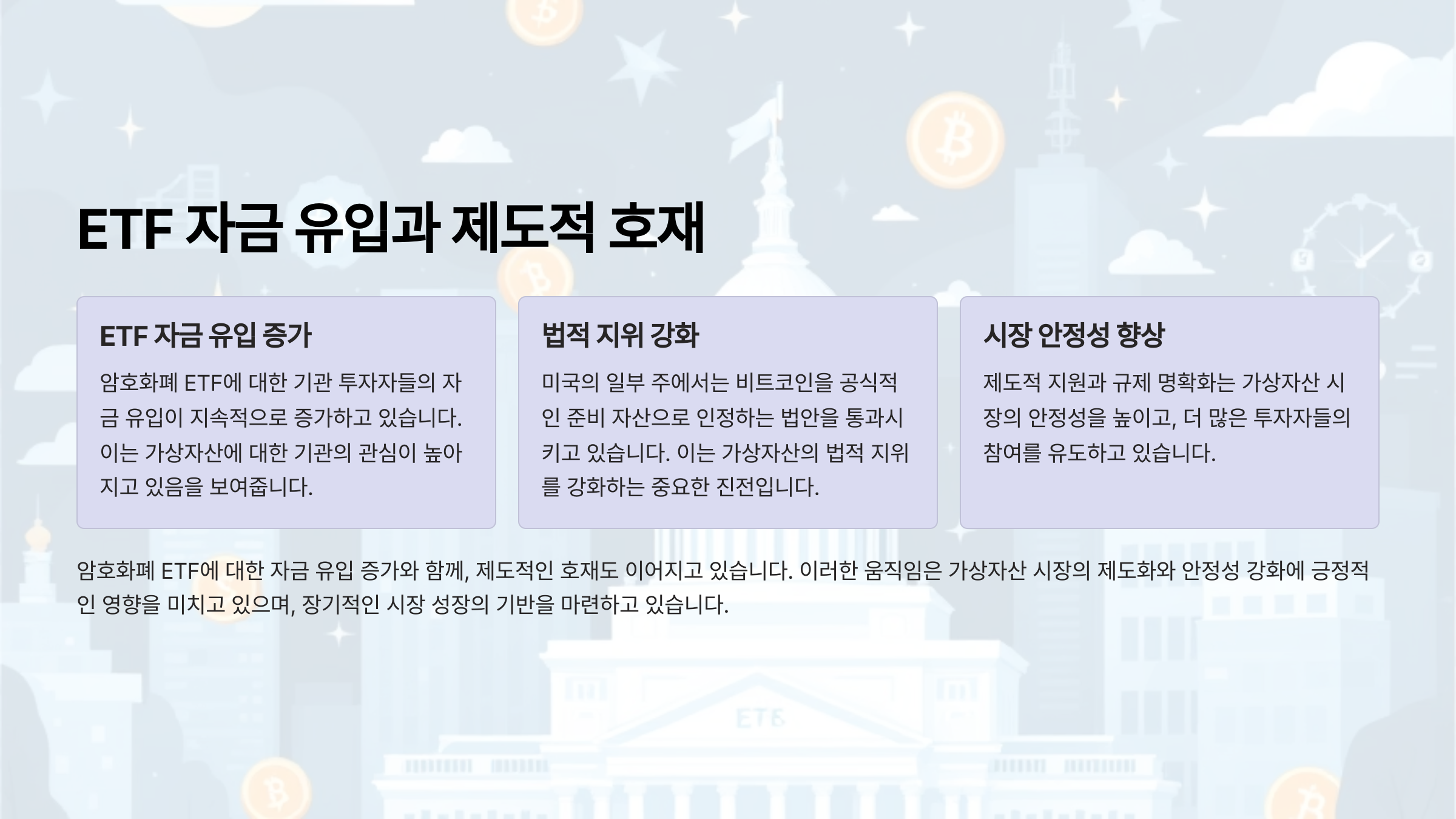 최근 암호화폐 ETF에 대한 자금 유입이 증가하고 있으며, 이는 기관 투자자들의 관심이 높아지고 있음을 나타냅니다. 또한, 미국의 일부 주에서는 비트코인을 공식적인 준비 자산으로 인정하는 법안을 통과시키는 등 제도적인 호재도 이어지고 있습니다. 이러한 움직임은 암호화폐 시장의 제도화와 안정성 강화에 긍정적인 영향을 미치고 있습니다.