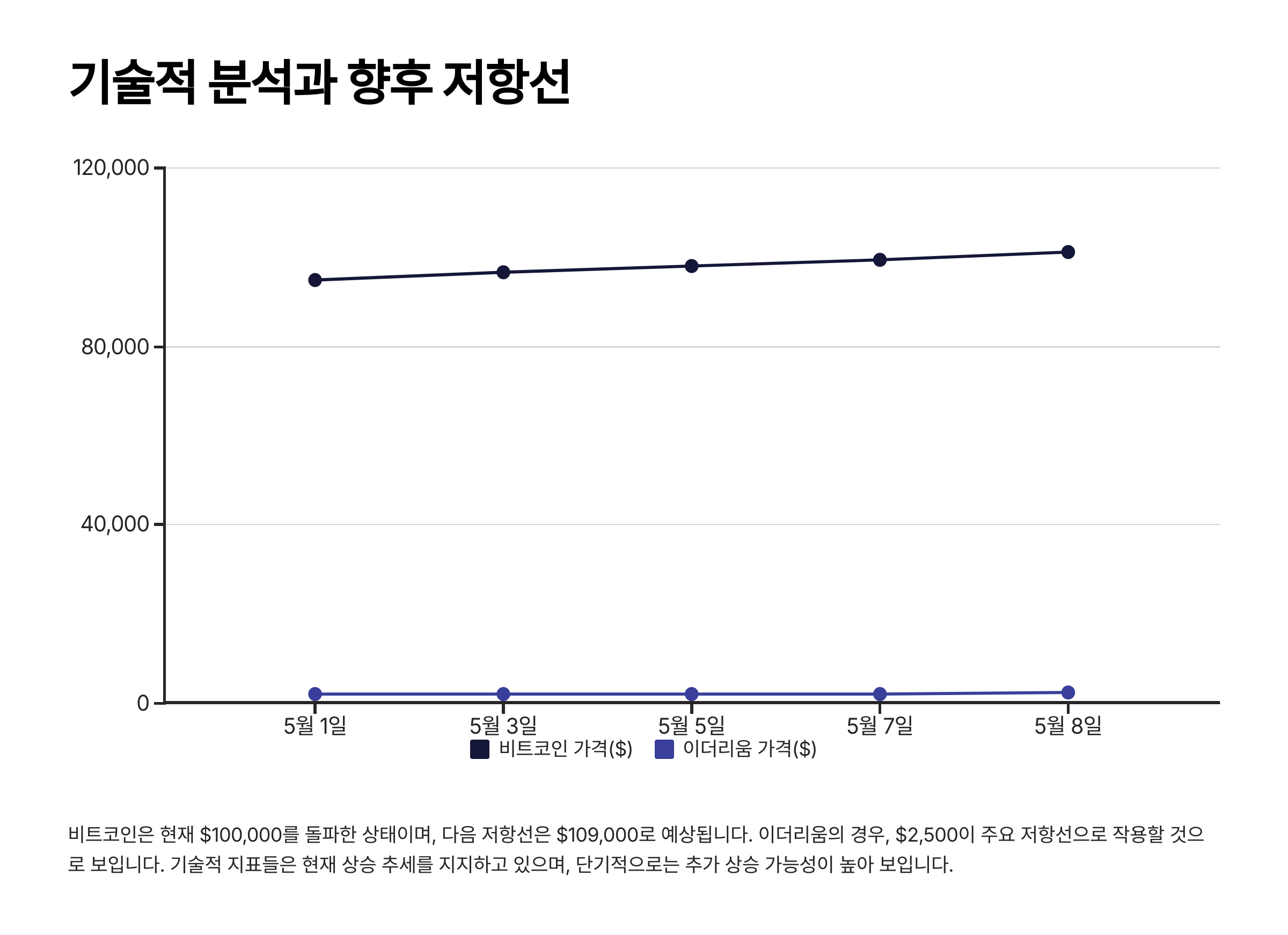 비트코인은 현재 $100,000를 돌파한 상태이며, 다음 저항선은 $109,000로 예상됩니다. 이더리움의 경우, $2,500이 주요 저항선으로 작용할 것으로 보입니다. 기술적 지표들은 현재 상승 추세를 지지하고 있으며, 단기적으로는 추가 상승 가능성이 높아 보입니다.