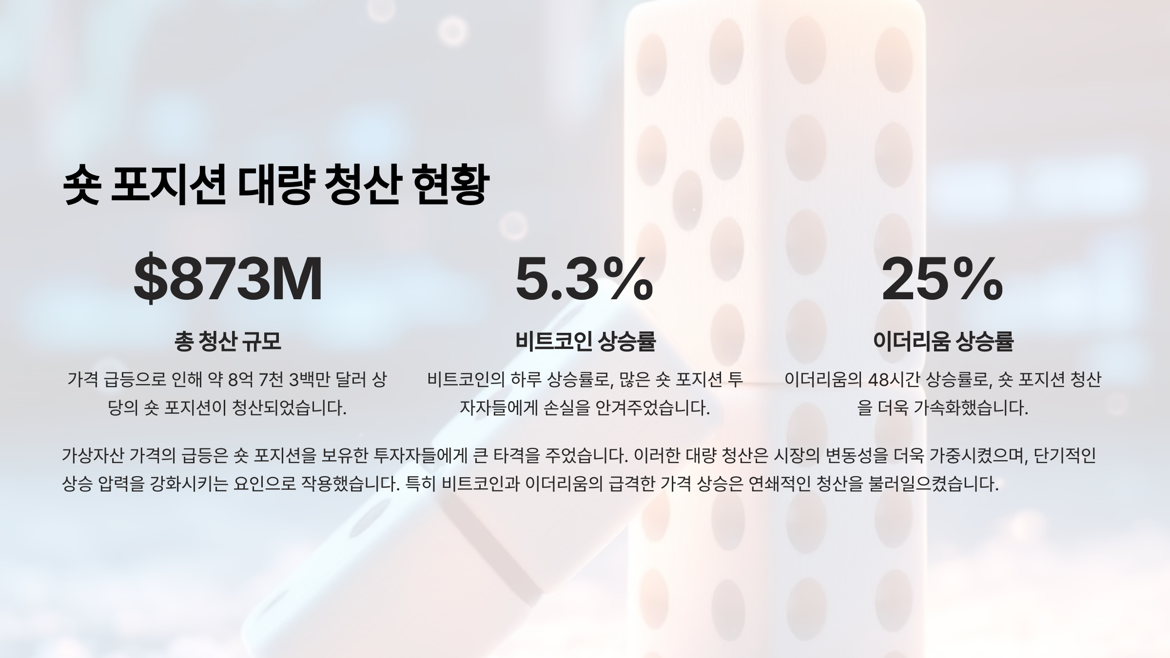 가격 급등으로 인해 약 $873 million 상당의 숏 포지션이 청산되었습니다. 특히 비트코인과 이더리움의 급등은 숏 포지션을 보유한 투자자들에게 큰 손실을 안겨주었으며, 이는 시장의 변동성을 더욱 가중시켰습니다. 이러한 대량 청산은 시장의 단기적인 상승 압력을 더욱 강화시키는 요인으로 작용했습니다.