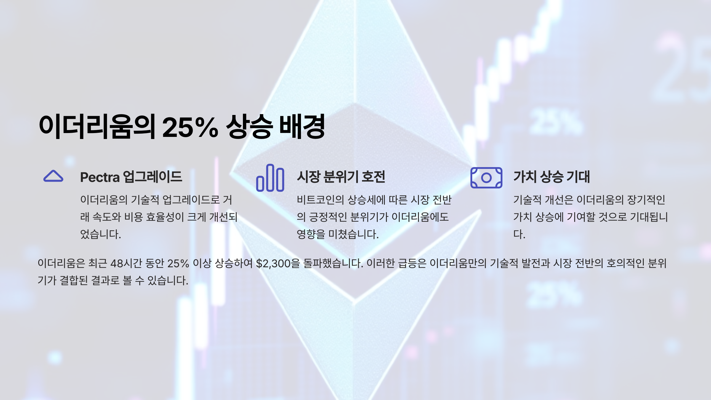 이더리움은 최근 48시간 동안 25% 이상 상승하여 $2,300을 돌파했습니다. 이는 이더리움의 'Pectra' 업그레이드로 인한 거래 속도 및 비용 효율성 개선과 더불어, 비트코인의 상승세에 따른 시장 전반의 긍정적인 분위기가 작용한 결과입니다. 이러한 기술적 개선은 이더리움의 장기적인 가치 상승에 기여할 것으로 기대됩니다.