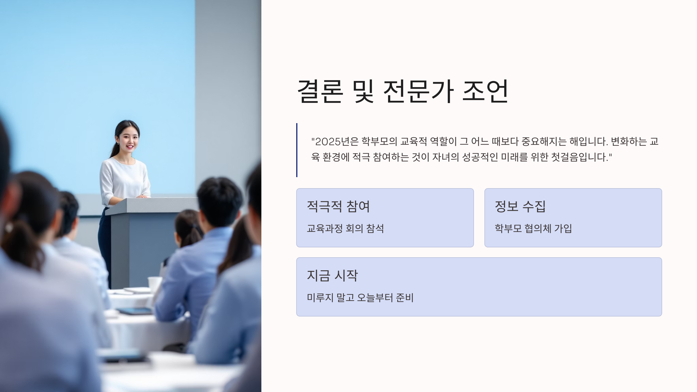 "2025년은 학부모의 교육적 역할이 그 어느 때보다 중요해지는 해입니다. 변화하는 교육 환경에 적극 참여하는 것이 자녀의 성공적인 미래를 위한 첫걸음입니다."