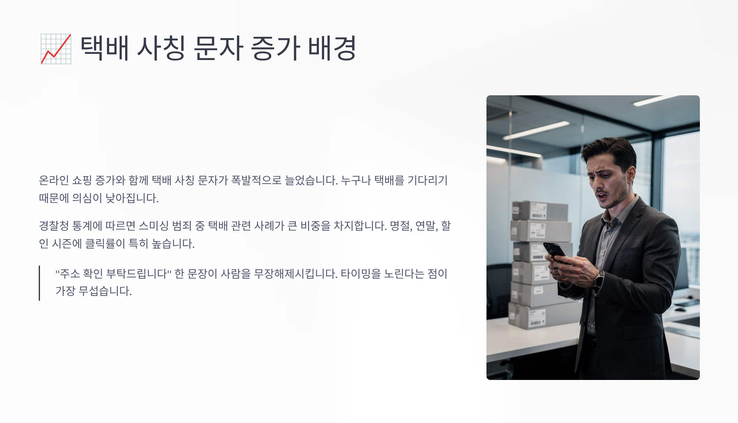 택배 사칭 문자는 온라인 쇼핑 증가와 함께 폭발적으로 늘어났습니다. 누구나 택배를 기다리는 시대이기 때문에 의심이 낮아집니다. 특히 명절, 연말, 할인 행사 시즌에는 클릭률이 높아진다고 알려져 있습니다.