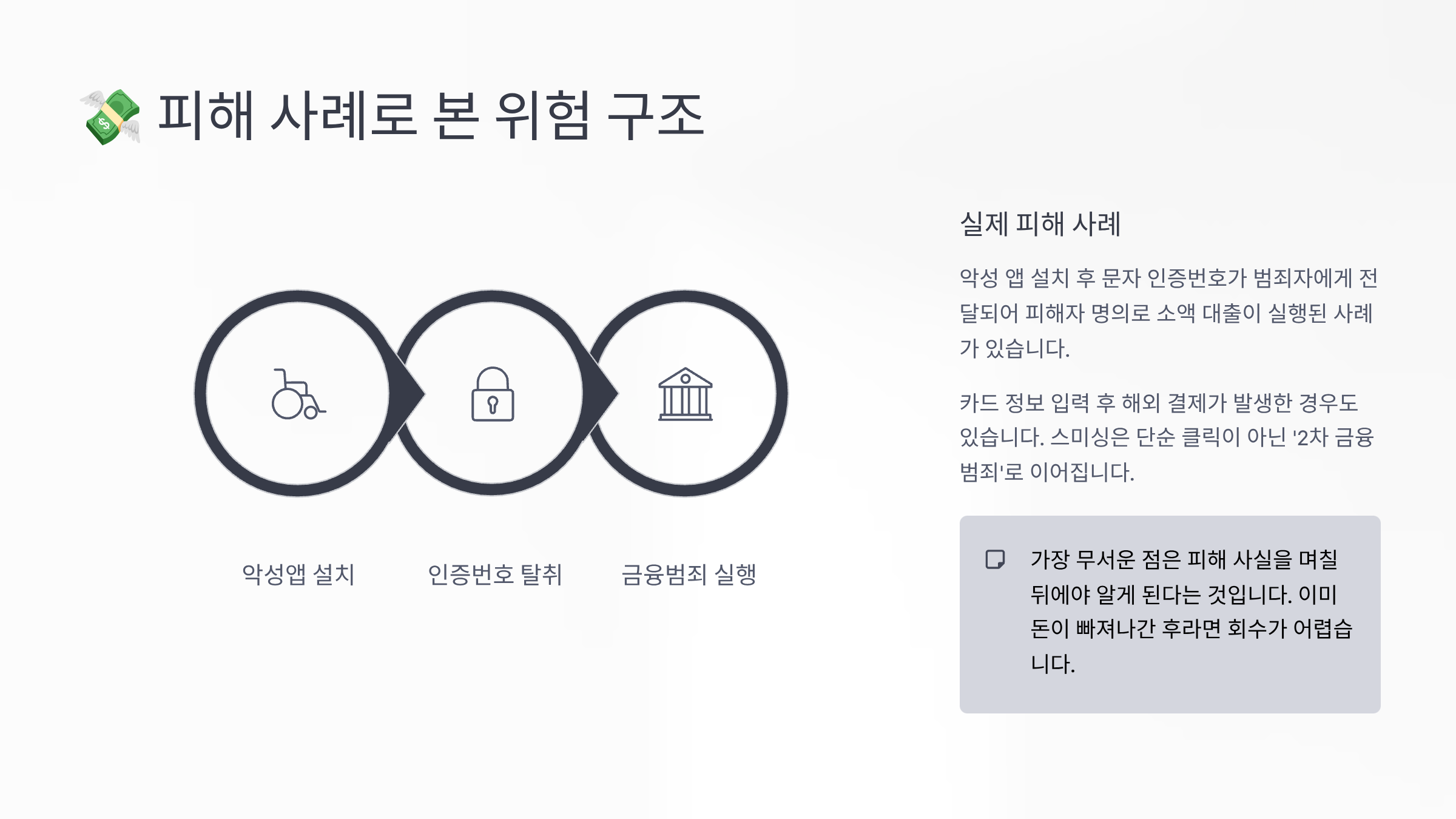 한 사례에서는 악성 앱 설치 후 문자 인증번호가 범죄자에게 전달되었고, 피해자 명의로 소액 대출이 실행되었습니다. 또 다른 사례에서는 카드 정보 입력 후 해외 결제가 발생했습니다.