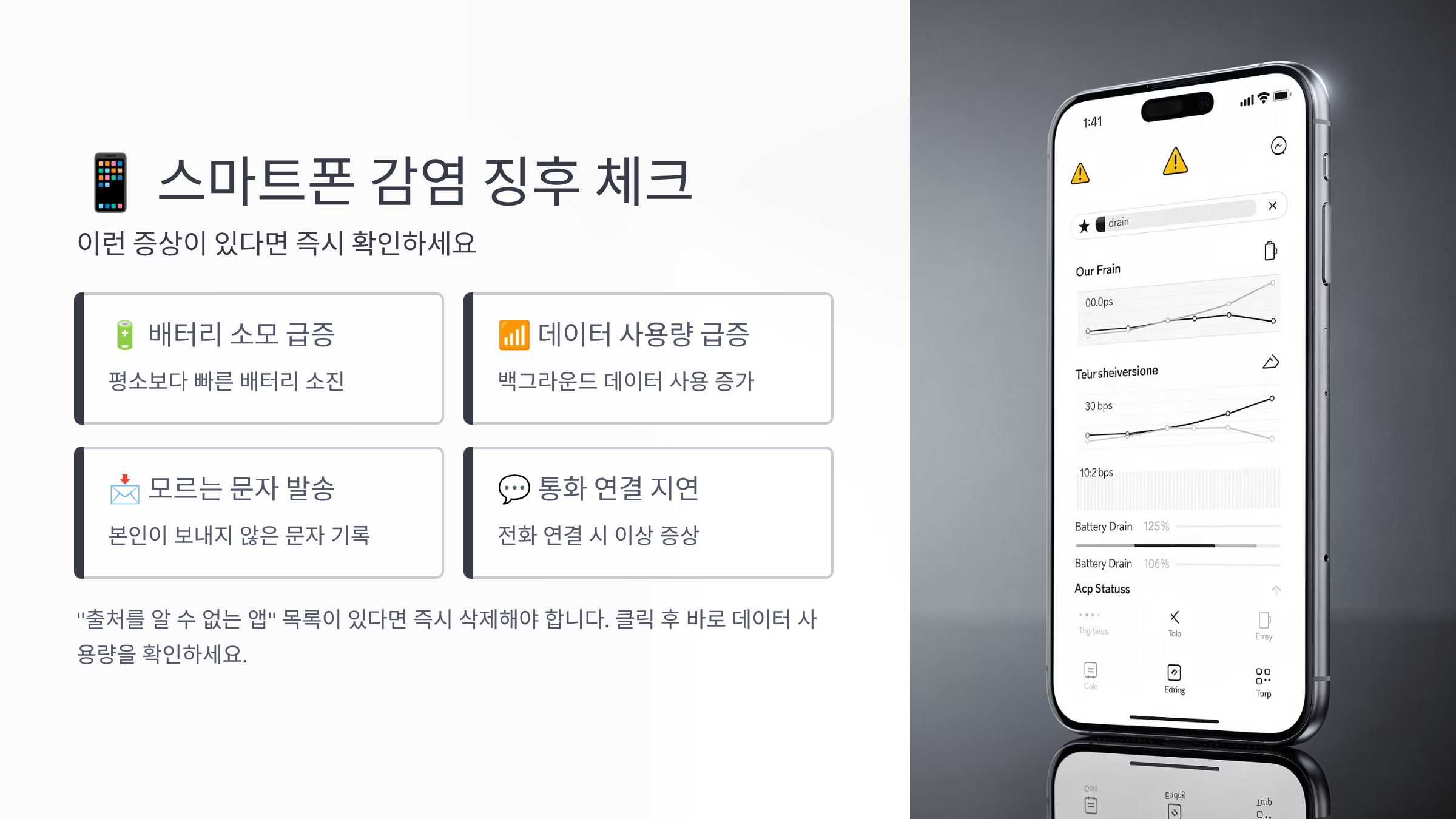 이런 증상이 있다면 악성 앱 감염 가능성을 의심해야 합니다. 특히 “출처를 알 수 없는 앱” 목록이 있다면 즉시 삭제해야 합니다.