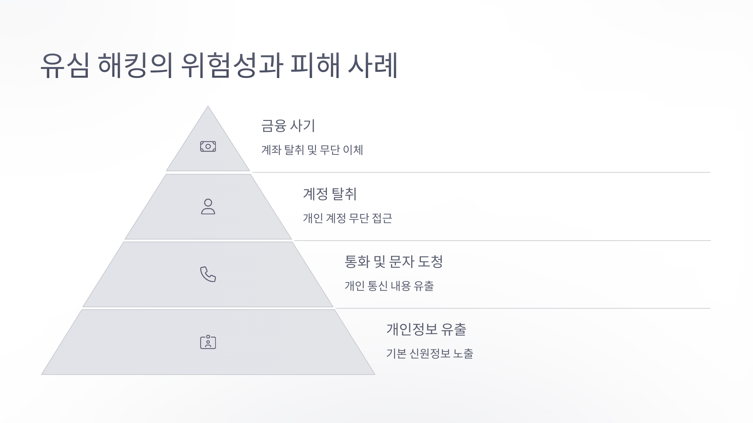 유심 해킹은 단순한 개인정보 유출을 넘어, 통화 및 문자 도청, 계정 탈취, 금융 사기 등 심각한 피해로 이어질 수 있습니다. 실제로 일부 고객은 해킹 이후 스미싱 피해를 입었다는 사례도 보고되었습니다. :contentReference[oaicite:1]{index=1}