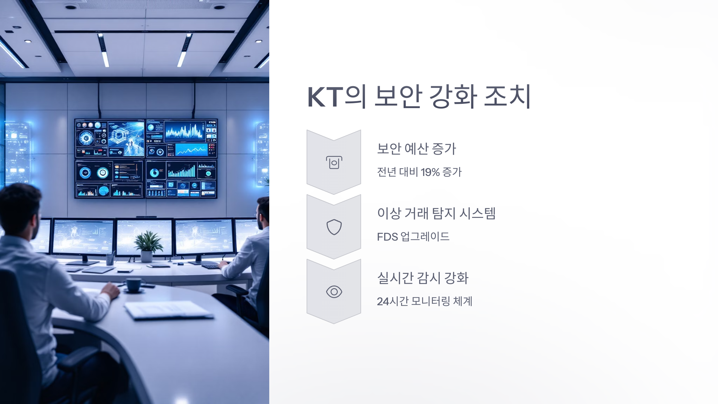 KT는 이번 사태를 계기로 보안 시스템을 강화하고 있습니다. 지난해 보안 예산을 19% 증가시켰으며, 이상 거래 탐지 시스템(FDS)을 업그레이드하여 실시간 감시를 강화하고 있습니다. :contentReference[oaicite:2]{index=2}