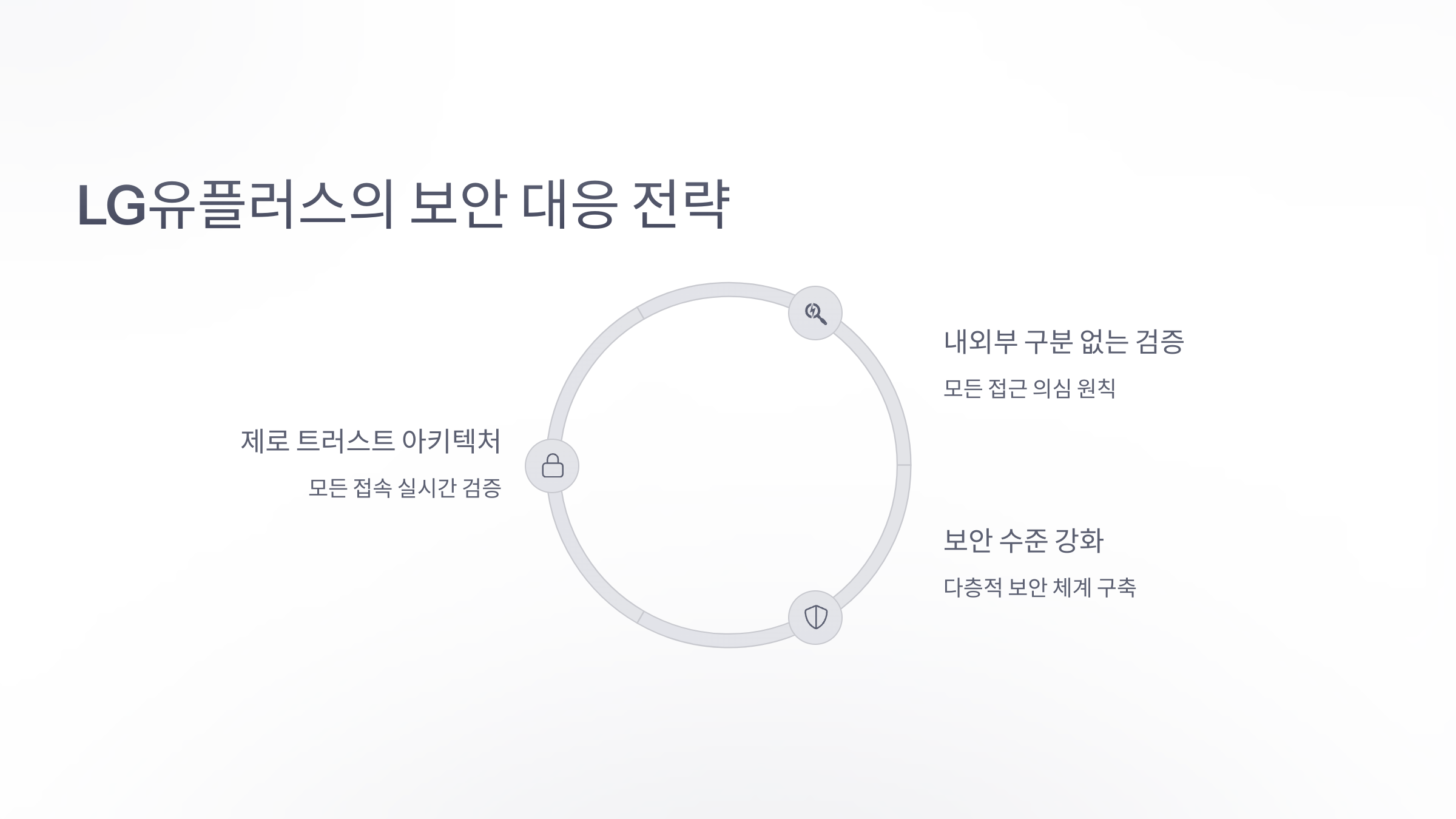 LG유플러스는 '제로 트러스트 아키텍처'를 도입하여 모든 접속을 실시간으로 검증하고 있습니다. 이를 통해 내부와 외부를 구분하지 않고 모든 접근을 의심하며, 보안 수준을 높이고 있습니다. :contentReference[oaicite:3]{index=3}