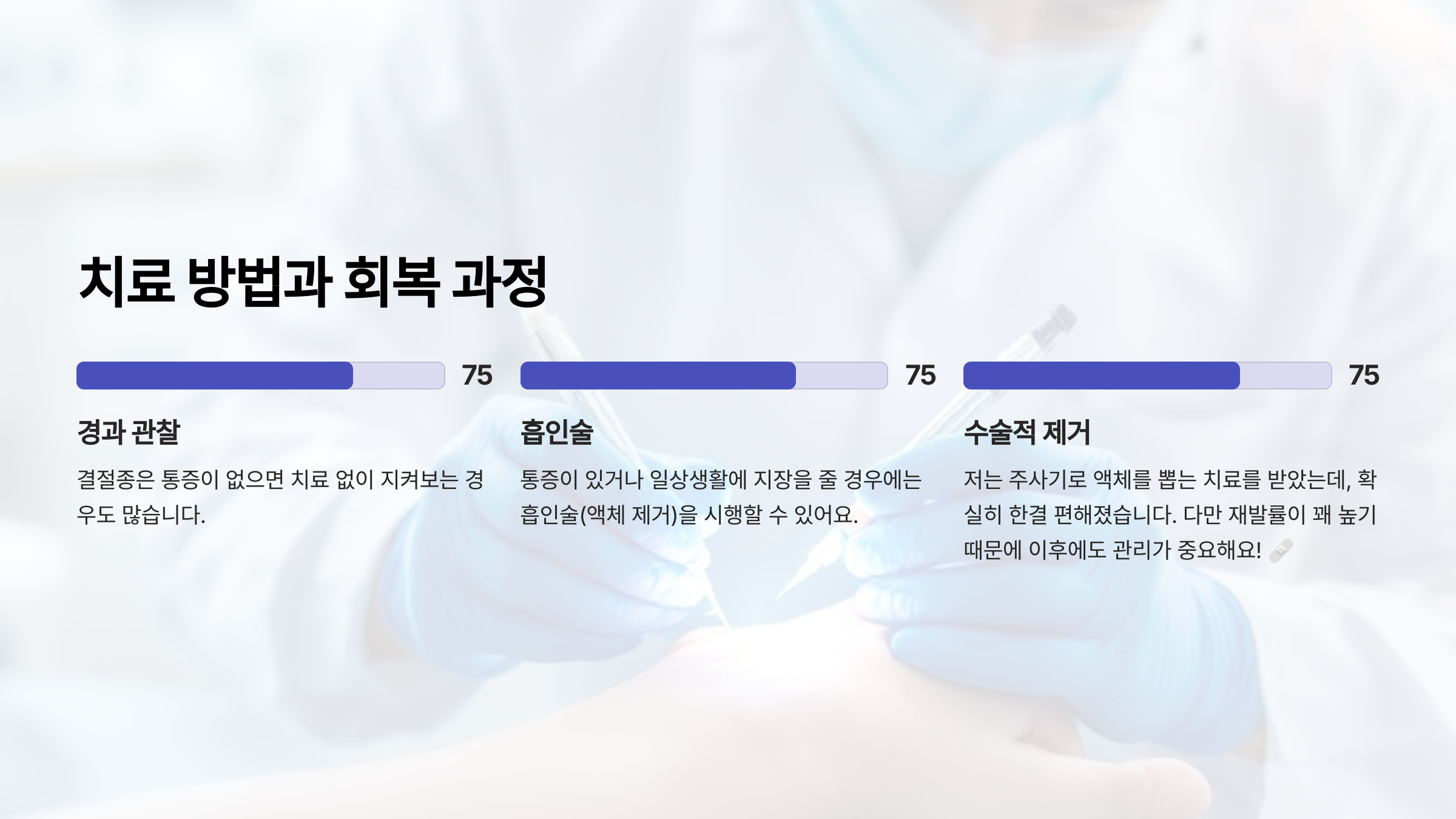 결절종은 통증이 없으면 치료 없이 지켜보는 경우도 많습니다. 그러나 통증이 있거나 일상생활에 지장을 줄 경우에는 흡인술(액체 제거), 또는 수술적 제거를 시행할 수 있어요. 저는 주사기로 액체를 뽑는 치료를 받았는데, 확실히 한결 편해졌습니다. 다만 재발률이 꽤 높기 때문에 이후에도 관리가 중요해요! 🩹