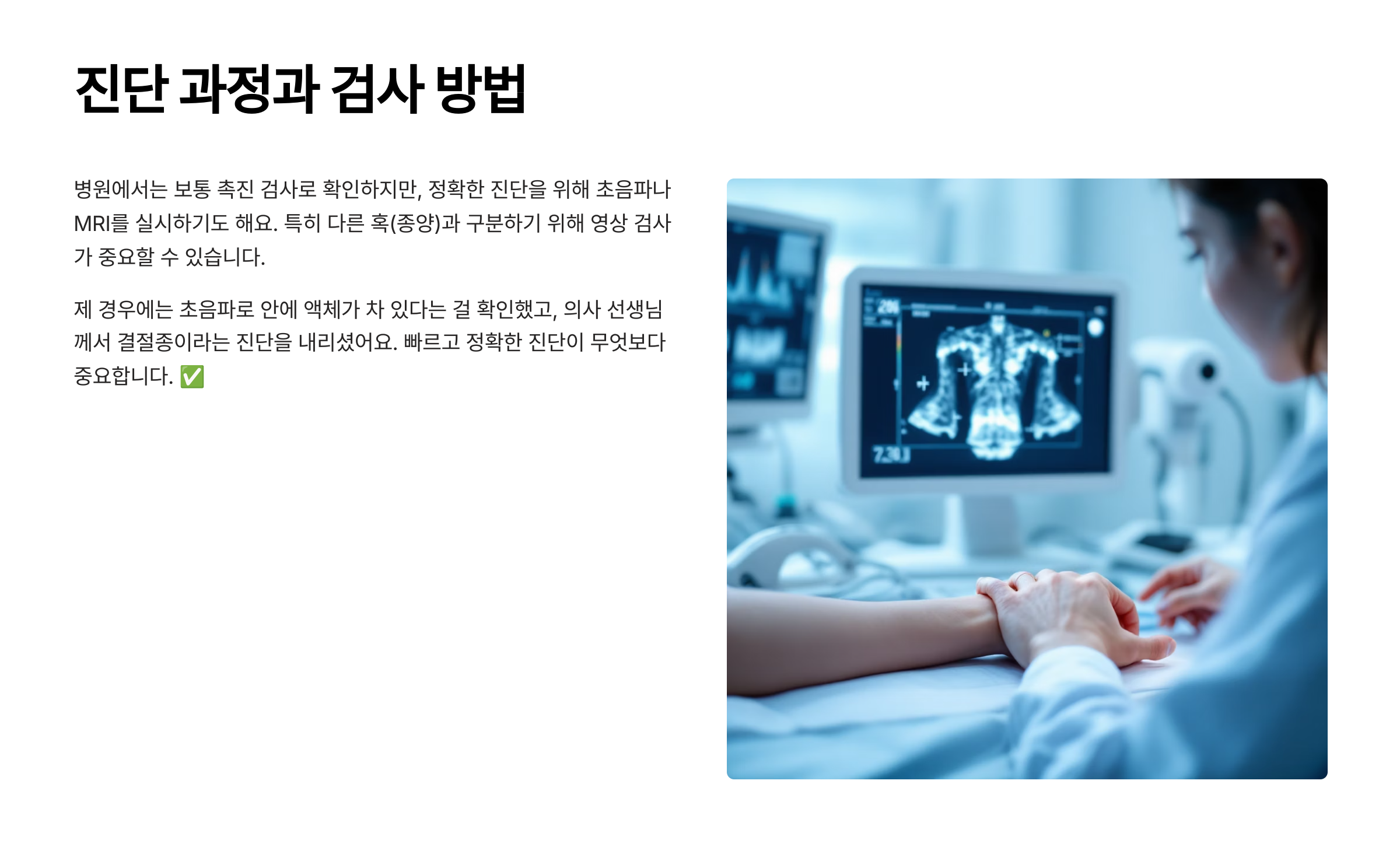병원에서는 보통 촉진 검사로 확인하지만, 정확한 진단을 위해 초음파나 MRI를 실시하기도 해요. 특히 다른 혹(종양)과 구분하기 위해 영상 검사가 중요할 수 있습니다. 제 경우에는 초음파로 안에 액체가 차 있다는 걸 확인했고, 의사 선생님께서 결절종이라는 진단을 내리셨어요. 빠르고 정확한 진단이 무엇보다 중요합니다. ✅