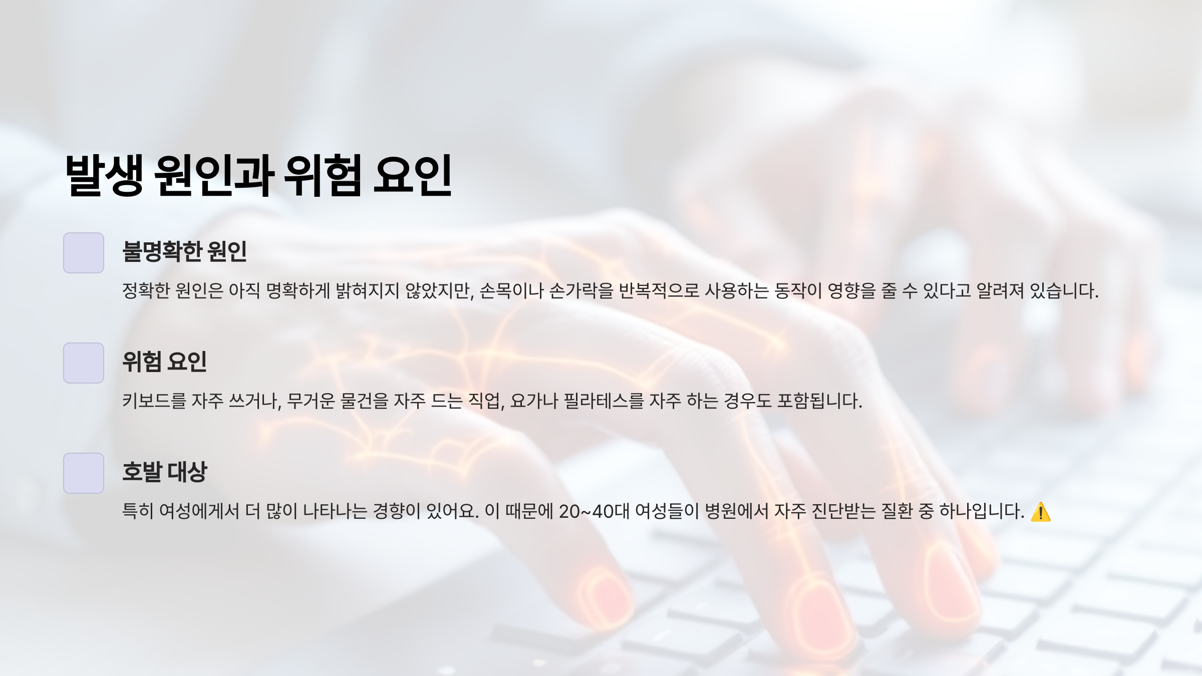 정확한 원인은 아직 명확하게 밝혀지지 않았지만, 손목이나 손가락을 반복적으로 사용하는 동작이 영향을 줄 수 있다고 알려져 있습니다. 키보드를 자주 쓰거나, 무거운 물건을 자주 드는 직업, 요가나 필라테스를 자주 하는 경우도 포함됩니다. 특히 여성에게서 더 많이 나타나는 경향이 있어요. 이 때문에 20~40대 여성들이 병원에서 자주 진단받는 질환 중 하나입니다. ⚠️