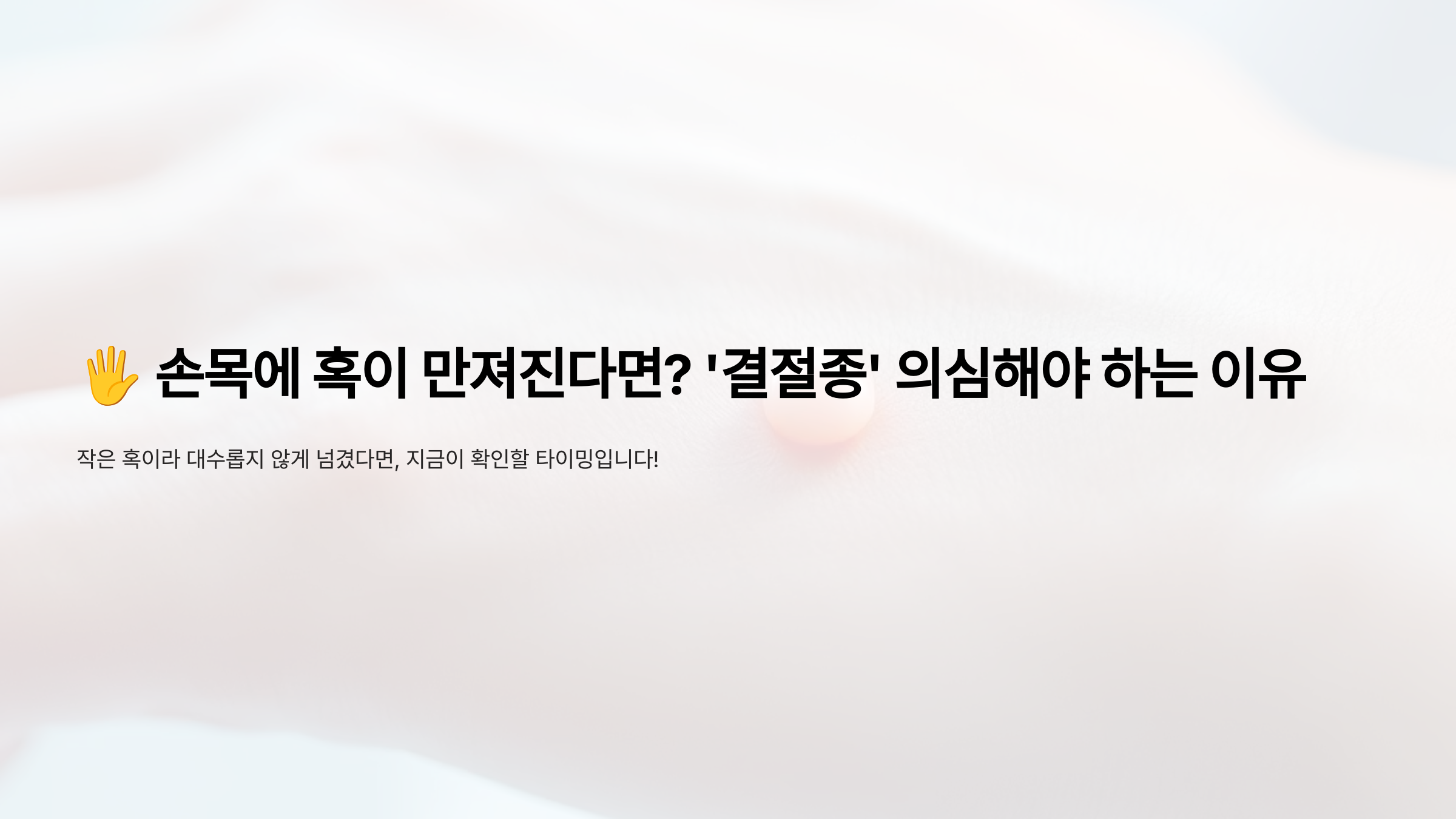 결절종(ganglion cyst)은 손목 부근이나 관절 근처에 생기는 말랑말랑한 혹입니다. 내부는 관절액으로 채워져 있어 물혹처럼 느껴지죠. 보통 손목 윗부분이나 손가락 관절 부근에 잘 생기며, 겉에서 보면 작은 종기 같지만 병리적으로는 무해한 경우가 많아요. 저도 처음에는 단순한 피로 누적이라 넘겼는데, 병원에 가보니 결절종이라는 진단을 받았습니다. 🙋♀️