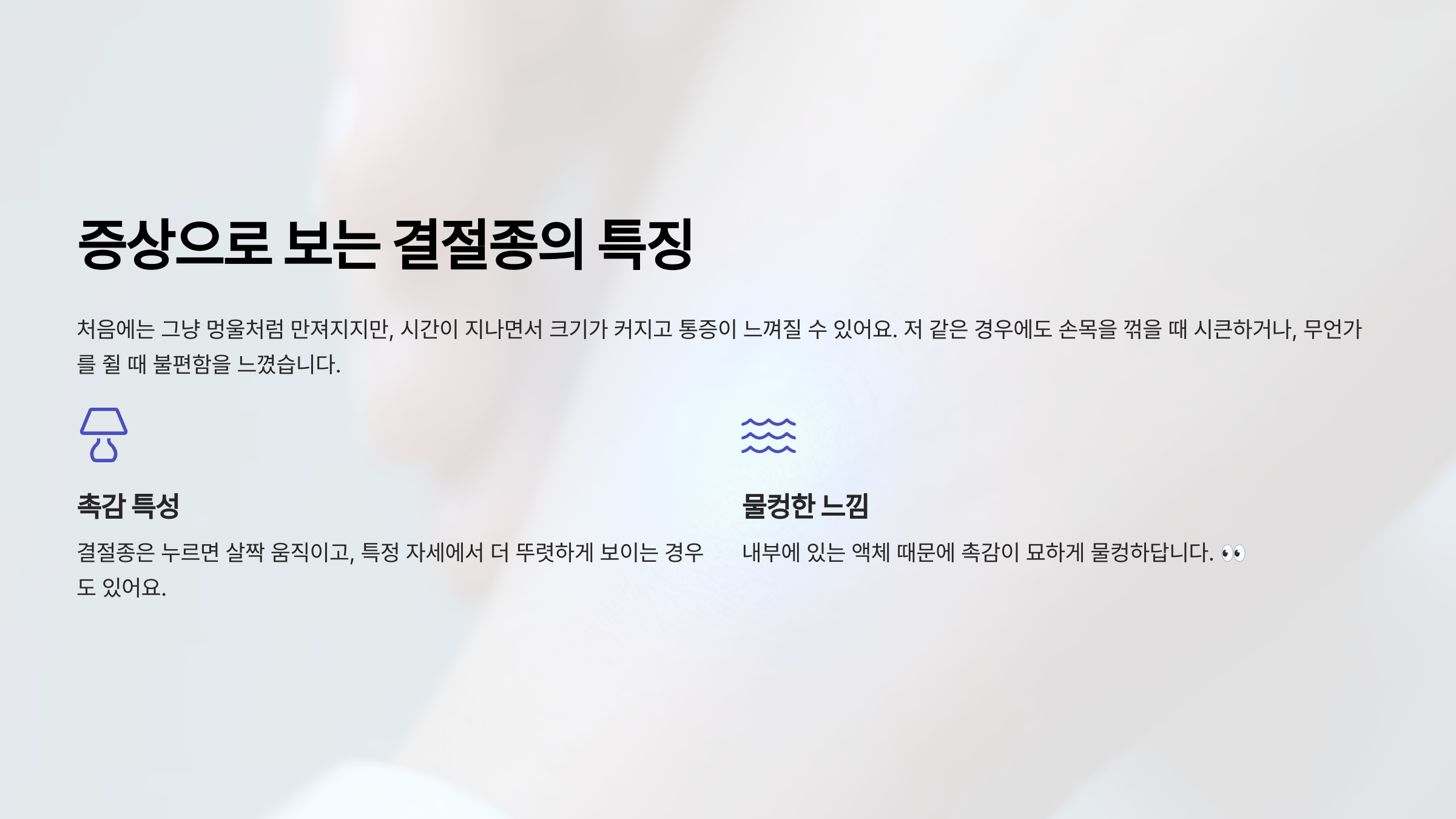 처음에는 그냥 멍울처럼 만져지지만, 시간이 지나면서 크기가 커지고 통증이 느껴질 수 있어요. 저 같은 경우에도 손목을 꺾을 때 시큰하거나, 무언가를 쥘 때 불편함을 느꼈습니다. 결절종은 누르면 살짝 움직이고, 특정 자세에서 더 뚜렷하게 보이는 경우도 있어요. 내부에 있는 액체 때문에 촉감이 묘하게 물컹하답니다. 👀