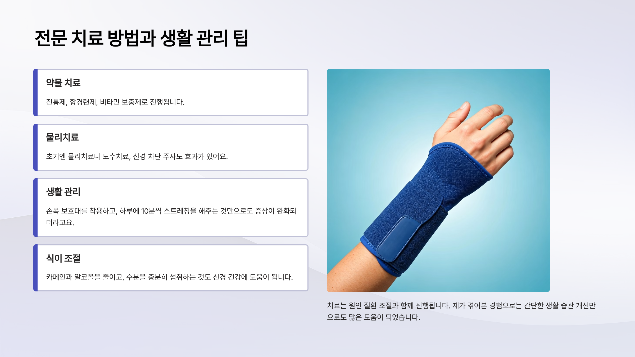 치료는 원인 질환 조절과 함께 약물 치료(진통제, 항경련제, 비타민 보충제)로 진행됩니다. 초기엔 물리치료나 도수치료, 신경 차단 주사도 효과가 있어요. 제가 겪어본 경험으로는 손목 보호대를 착용하고, 하루에 10분씩 스트레칭을 해주는 것만으로도 증상이 완화되더라고요. 카페인과 알코올을 줄이고, 수분을 충분히 섭취하는 것도 신경 건강에 도움이 됩니다.
