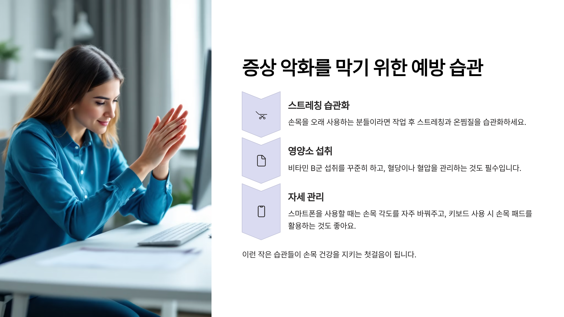 손목을 오래 사용하는 분들이라면 작업 후 스트레칭과 온찜질을 습관화하세요. 비타민 B군 섭취를 꾸준히 하고, 혈당이나 혈압을 관리하는 것도 필수입니다. 스마트폰을 사용할 때는 손목 각도를 자주 바꿔주고, 키보드 사용 시 손목 패드를 활용하는 것도 좋아요. 이런 작은 습관들이 손목 건강을 지키는 첫걸음이 됩니다.