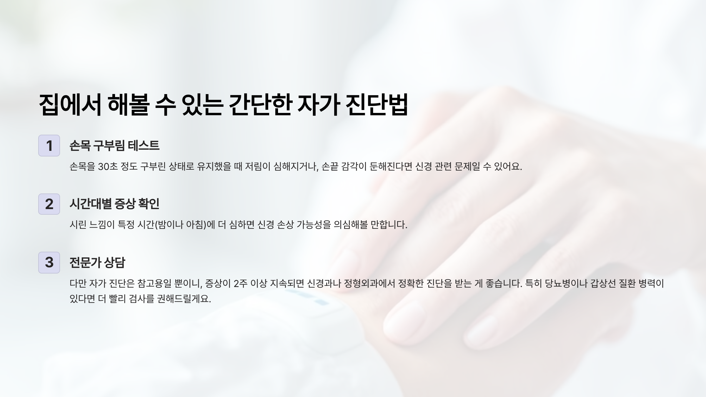 손목을 30초 정도 구부린 상태로 유지했을 때 저림이 심해지거나, 손끝 감각이 둔해진다면 신경 관련 문제일 수 있어요. 또한 시린 느낌이 특정 시간(밤이나 아침)에 더 심하면 신경 손상 가능성을 의심해볼 만합니다. 다만 자가 진단은 참고용일 뿐이니, 증상이 2주 이상 지속되면 신경과나 정형외과에서 정확한 진단을 받는 게 좋습니다. 특히 당뇨병이나 갑상선 질환 병력이 있다면 더 빨리 검사를 권해드릴게요.
