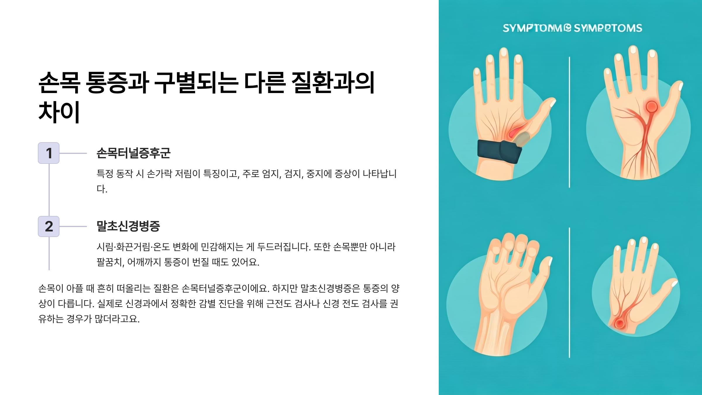 손목이 아플 때 흔히 떠올리는 질환은 손목터널증후군이에요. 하지만 말초신경병증은 통증의 양상이 다릅니다. 손목터널증후군은 특정 동작 시 손가락 저림이 특징이고, 말초신경병증은 시림·화끈거림·온도 변화에 민감해지는 게 두드러집니다. 또한 손목뿐만 아니라 팔꿈치, 어깨까지 통증이 번질 때도 있어요. 실제로 신경과에서 정확한 감별 진단을 위해 근전도 검사나 신경 전도 검사를 권유하는 경우가 많더라고요.
