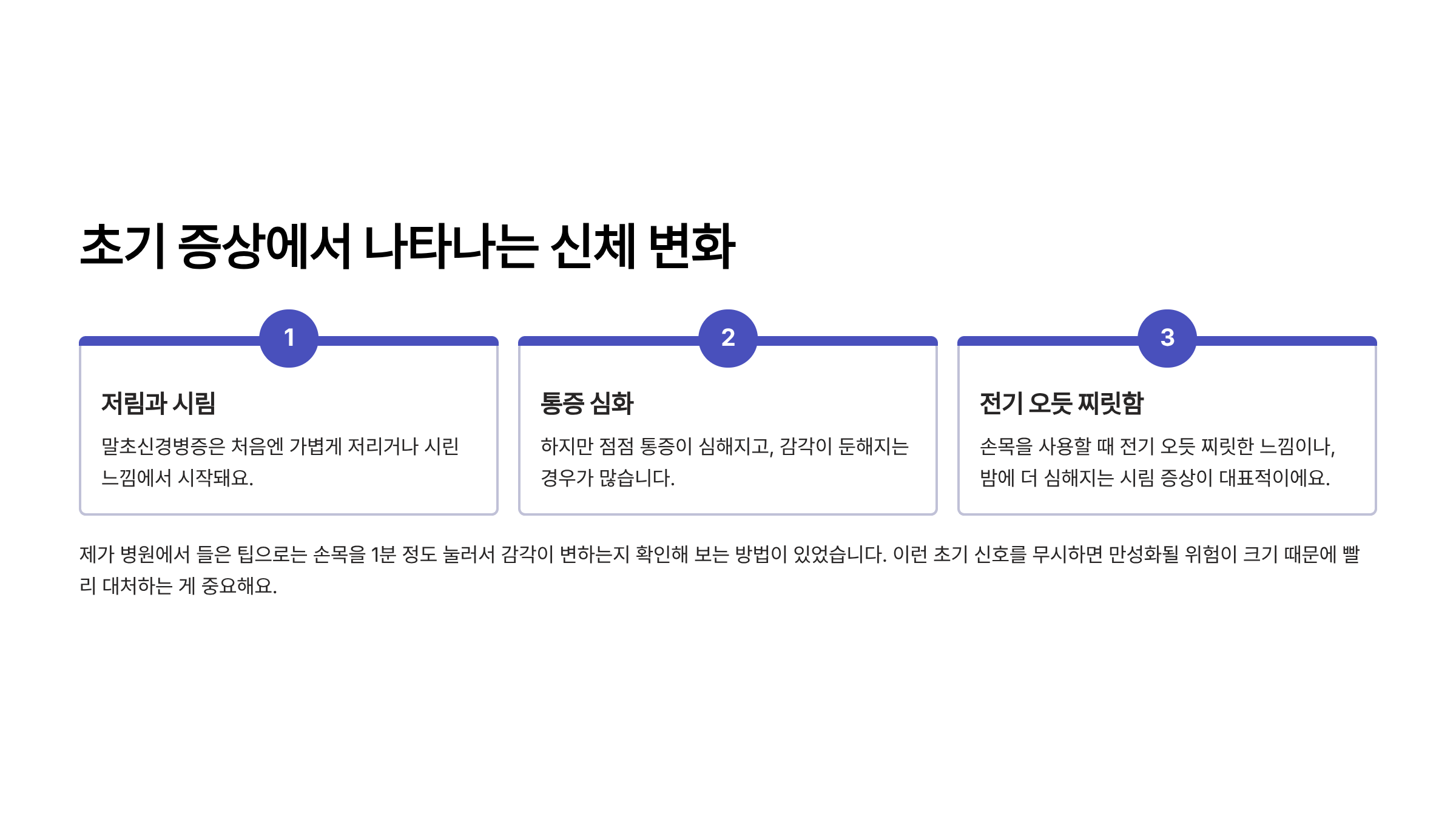 말초신경병증은 처음엔 가볍게 저리거나 시린 느낌에서 시작돼요. 하지만 점점 통증이 심해지고, 감각이 둔해지는 경우가 많습니다. 손목을 사용할 때 전기 오듯 찌릿한 느낌이나, 밤에 더 심해지는 시림 증상이 대표적이에요. 제가 병원에서 들은 팁으로는 손목을 1분 정도 눌러서 감각이 변하는지 확인해 보는 방법이 있었습니다. 이런 초기 신호를 무시하면 만성화될 위험이 크기 때문에 빨리 대처하는 게 중요해요.