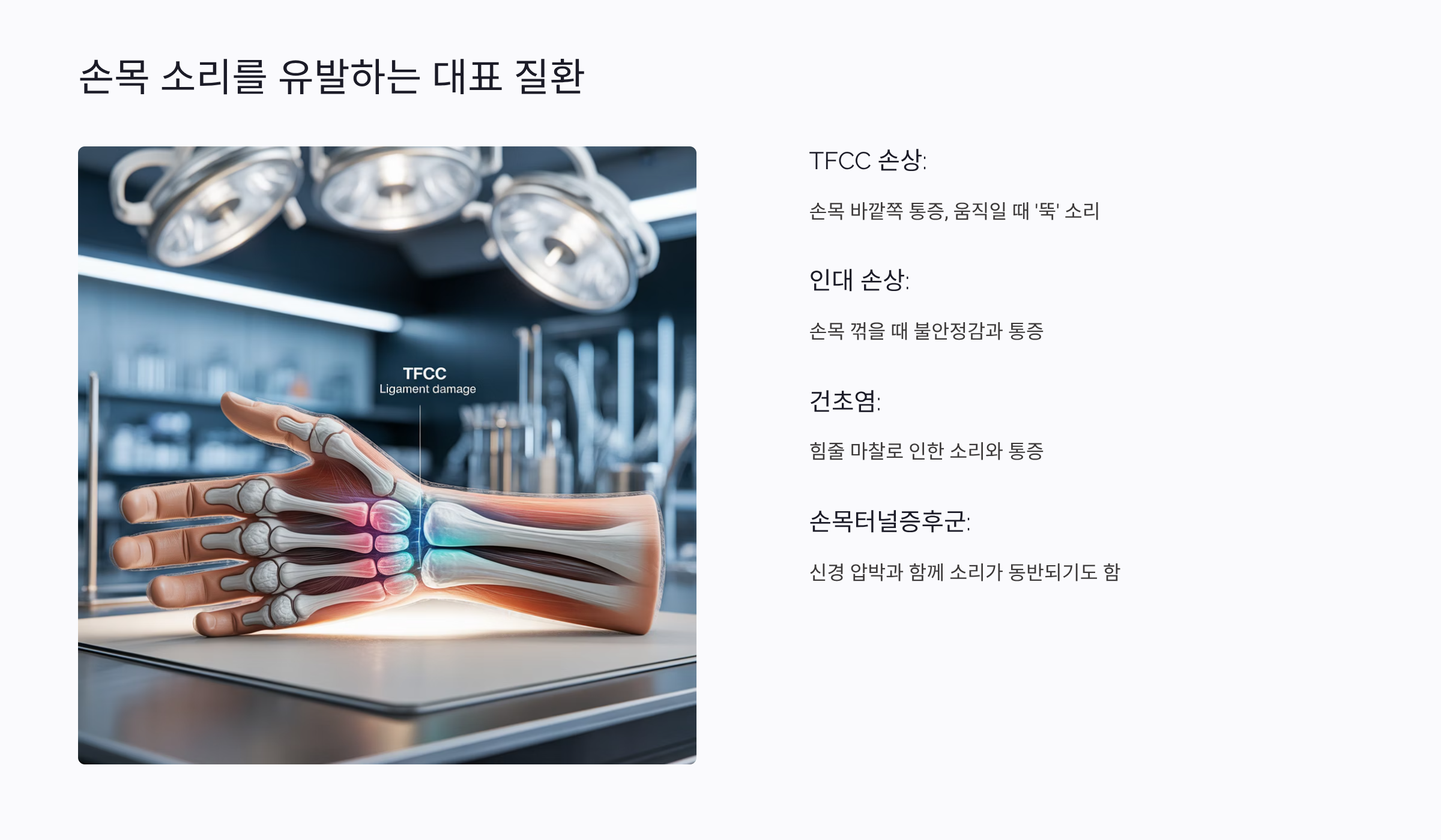 이런 경우는 단순한 관절 소리가 아니라 손목 인대 손상, 연골 손상, TFCC(삼각섬유연골복합체) 손상 같은 질환일 수 있어요.