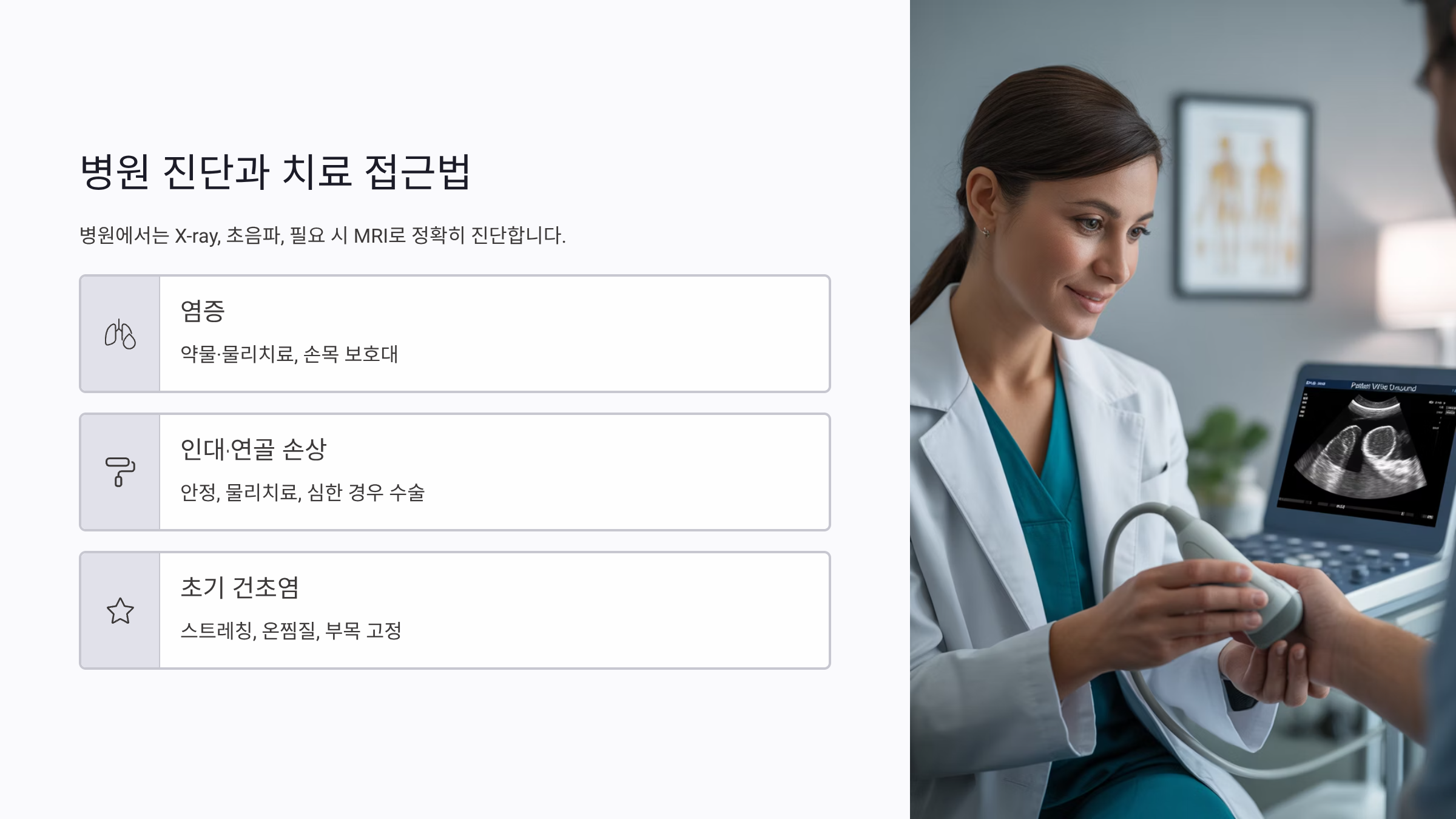 병원에서는 X-ray, 초음파, 필요 시 MRI로 정확히 진단합니다.