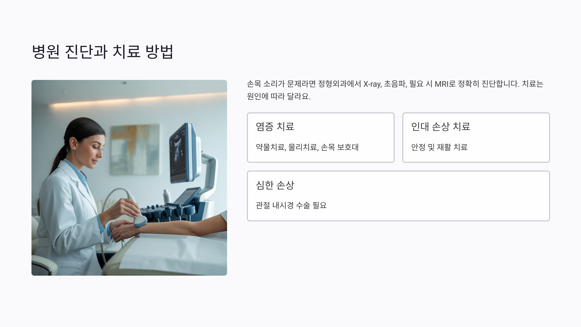 손목 소리가 문제라면 정형외과에서 X-ray, 초음파, 필요 시 MRI로 정확히 진단합니다.