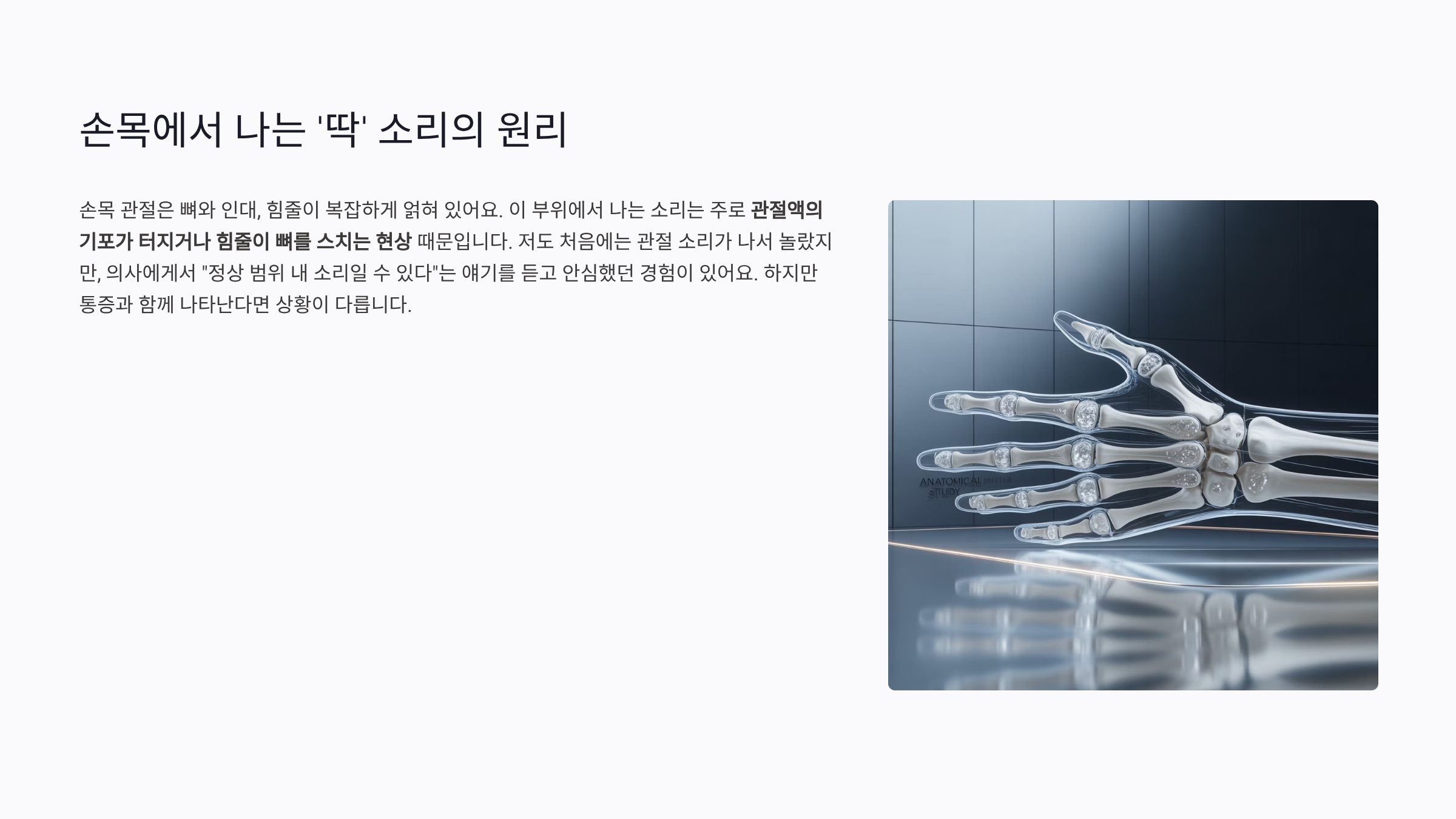 손목 관절은 뼈와 인대, 힘줄이 복잡하게 얽혀 있어요. 이 부위에서 나는 소리는 주로 관절액의 기포가 터지거나 힘줄이 뼈를 스치는 현상 때문입니다. 저도 처음에는 관절 소리가 나서 놀랐지만, 의사에게서 “정상 범위 내 소리일 수 있다”는 얘기를 듣고 안심했던 경험이 있어요. 하지만 통증과 함께 나타난다면 상황이 다릅니다.