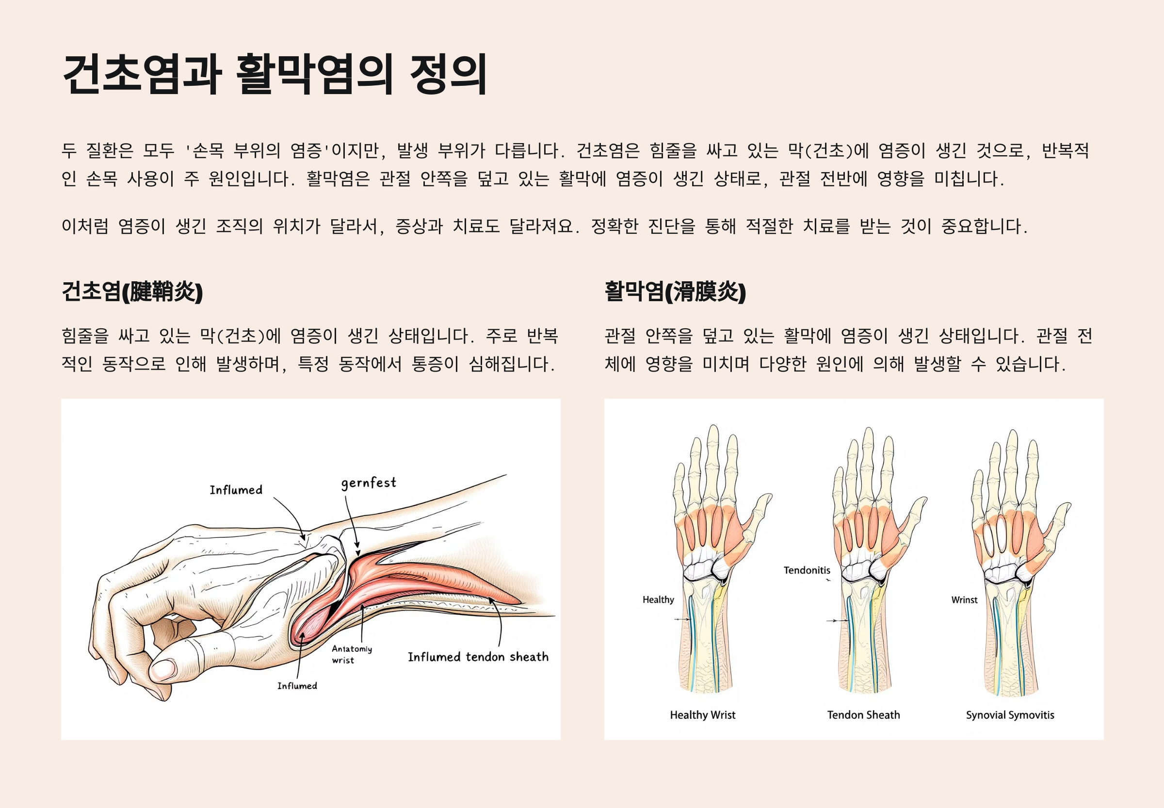 - 건초염(腱鞘炎): 힘줄을 싸고 있는 막(건초)에 염증이 생긴 것. 반복적인 손목 사용이 주 원인.