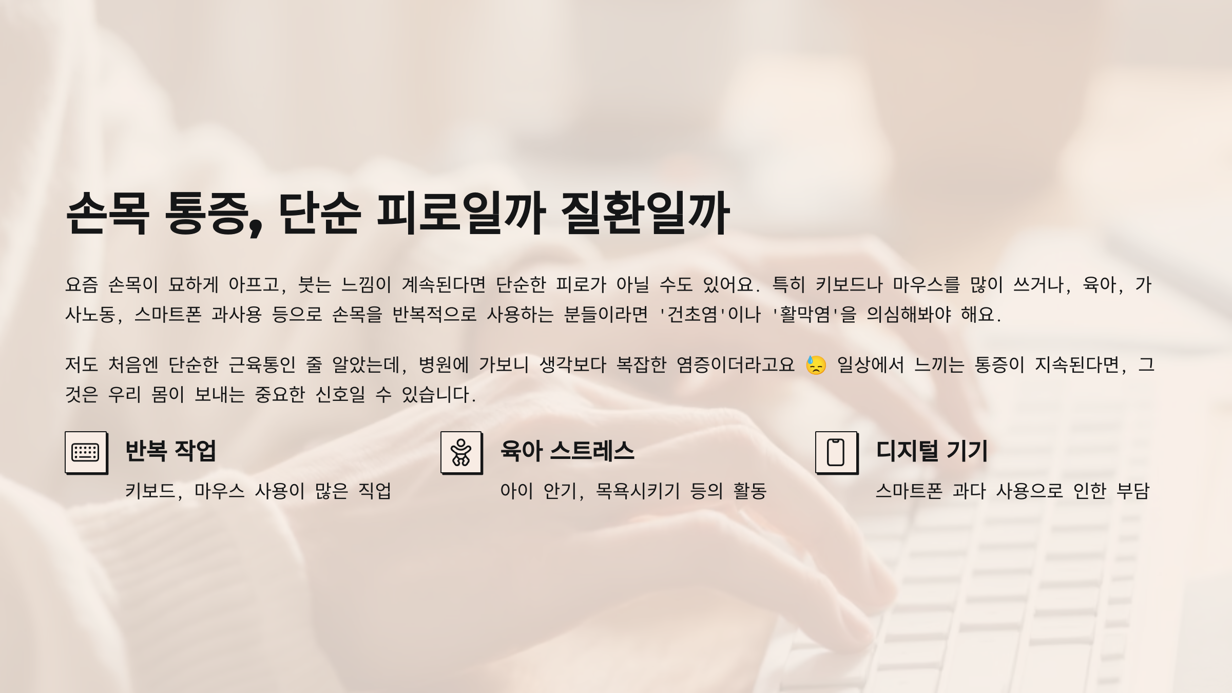 요즘 손목이 묘하게 아프고, 붓는 느낌이 계속된다면 단순한 피로가 아닐 수도 있어요. 특히 키보드나 마우스를 많이 쓰거나, 육아, 가사노동, 스마트폰 과사용 등으로 손목을 반복적으로 사용하는 분들이라면 ‘건초염’이나 ‘활막염’을 의심해봐야 해요. 저도 처음엔 단순한 근육통인 줄 알았는데, 병원에 가보니 생각보다 복잡한 염증이더라고요 😓