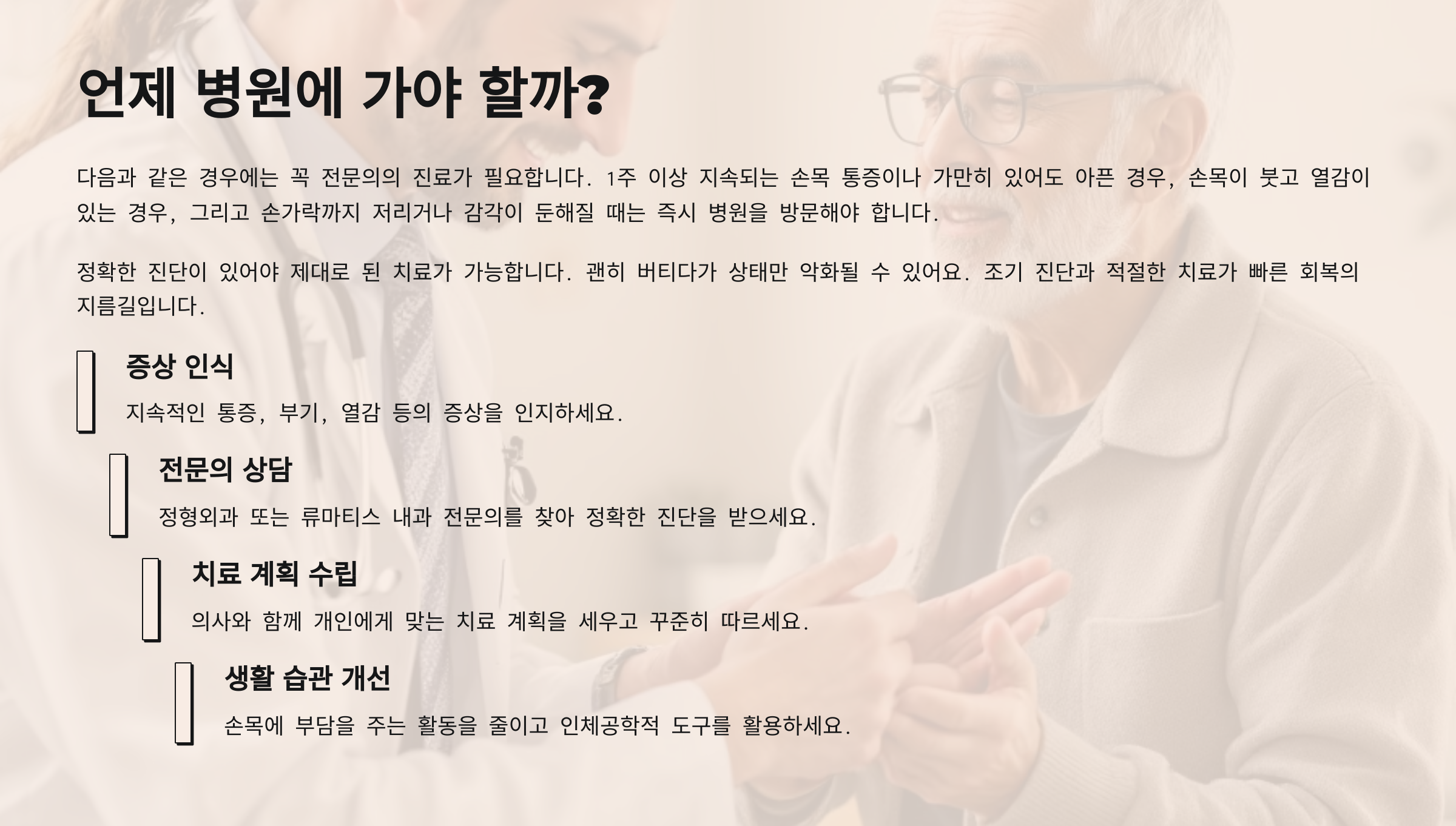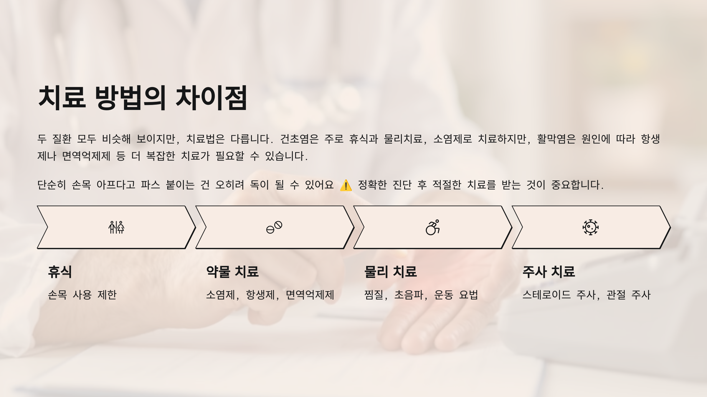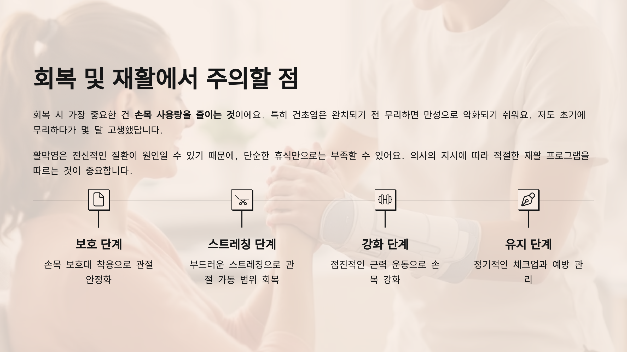 회복 시 가장 중요한 건 손목 사용량을 줄이는 것이에요. 특히 건초염은 완치되기 전 무리하면 만성으로 악화되기 쉬워요. 저도 초기에 무리하다가 몇 달 고생했답니다.