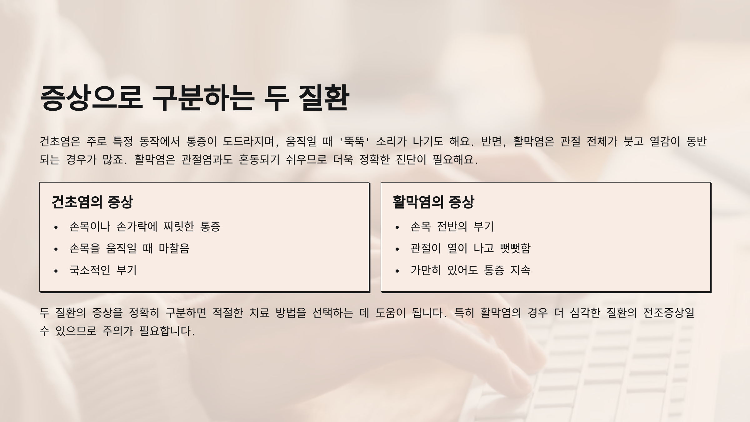 건초염은 주로 특정 동작에서 통증이 도드라지며, 움직일 때 ‘뚝뚝’ 소리가 나기도 해요. 반면, 활막염은 관절 전체가 붓고 열감이 동반되는 경우가 많죠.