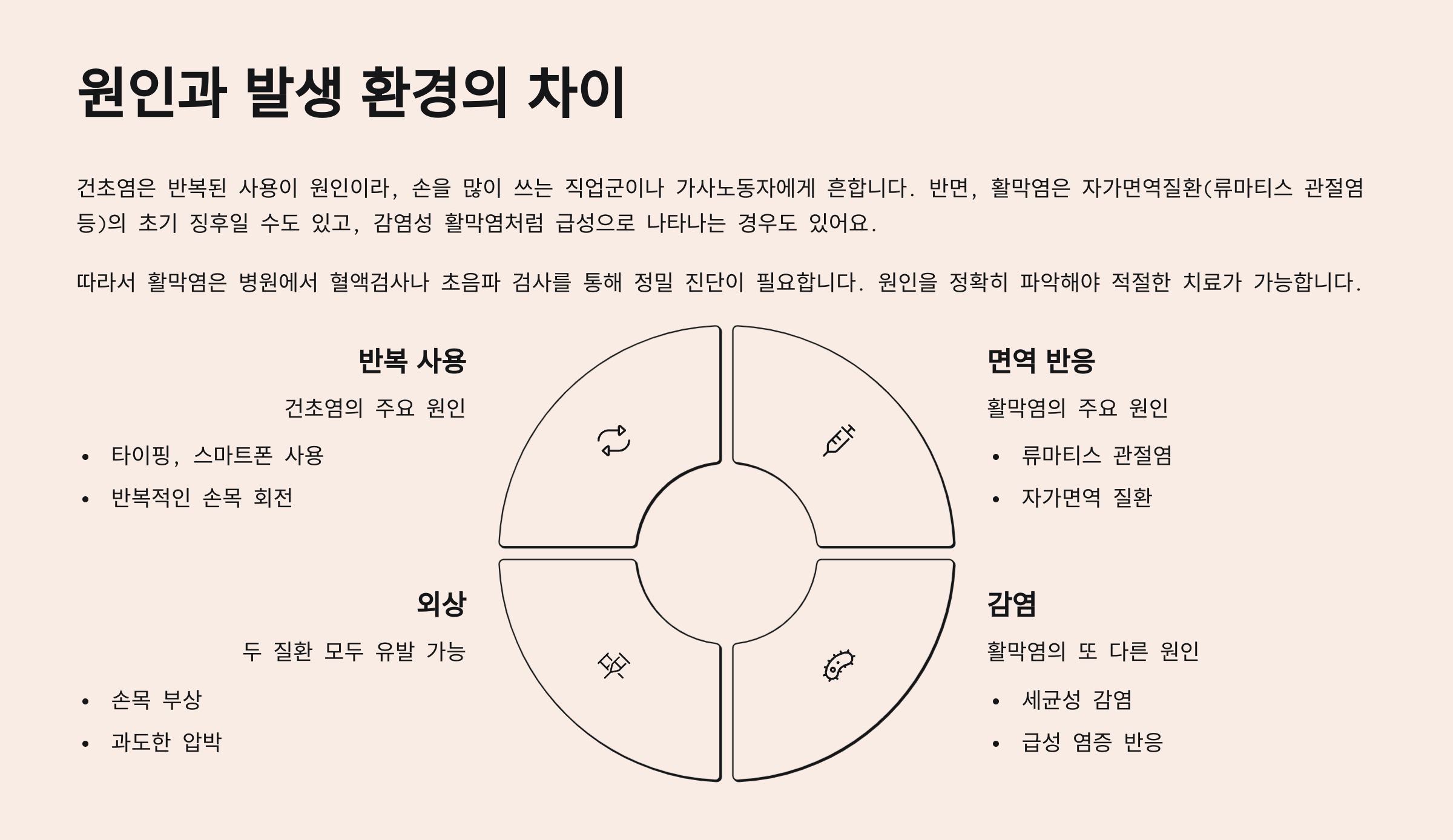 건초염은 반복된 사용이 원인이라, 손을 많이 쓰는 직업군이나 가사노동자에게 흔합니다. 반면, 활막염은 자가면역질환(류마티스 관절염 등)의 초기 징후일 수도 있고, 감염성 활막염처럼 급성으로 나타나는 경우도 있어요.