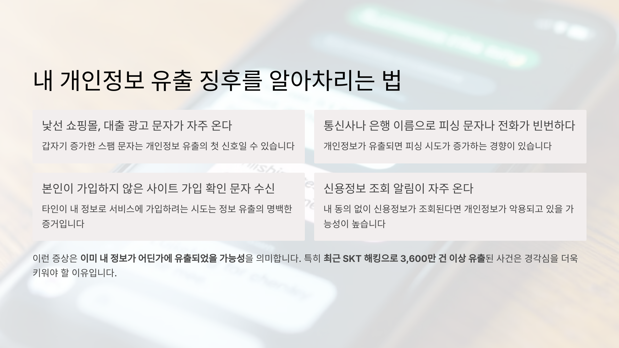 이런 증상은 이미 내 정보가 어딘가에 유출되었을 가능성을 의미합니다. 특히 최근 SKT 해킹으로 3,600만 건 이상 유출된 사건은 경각심을 더욱 키워야 할 이유입니다.