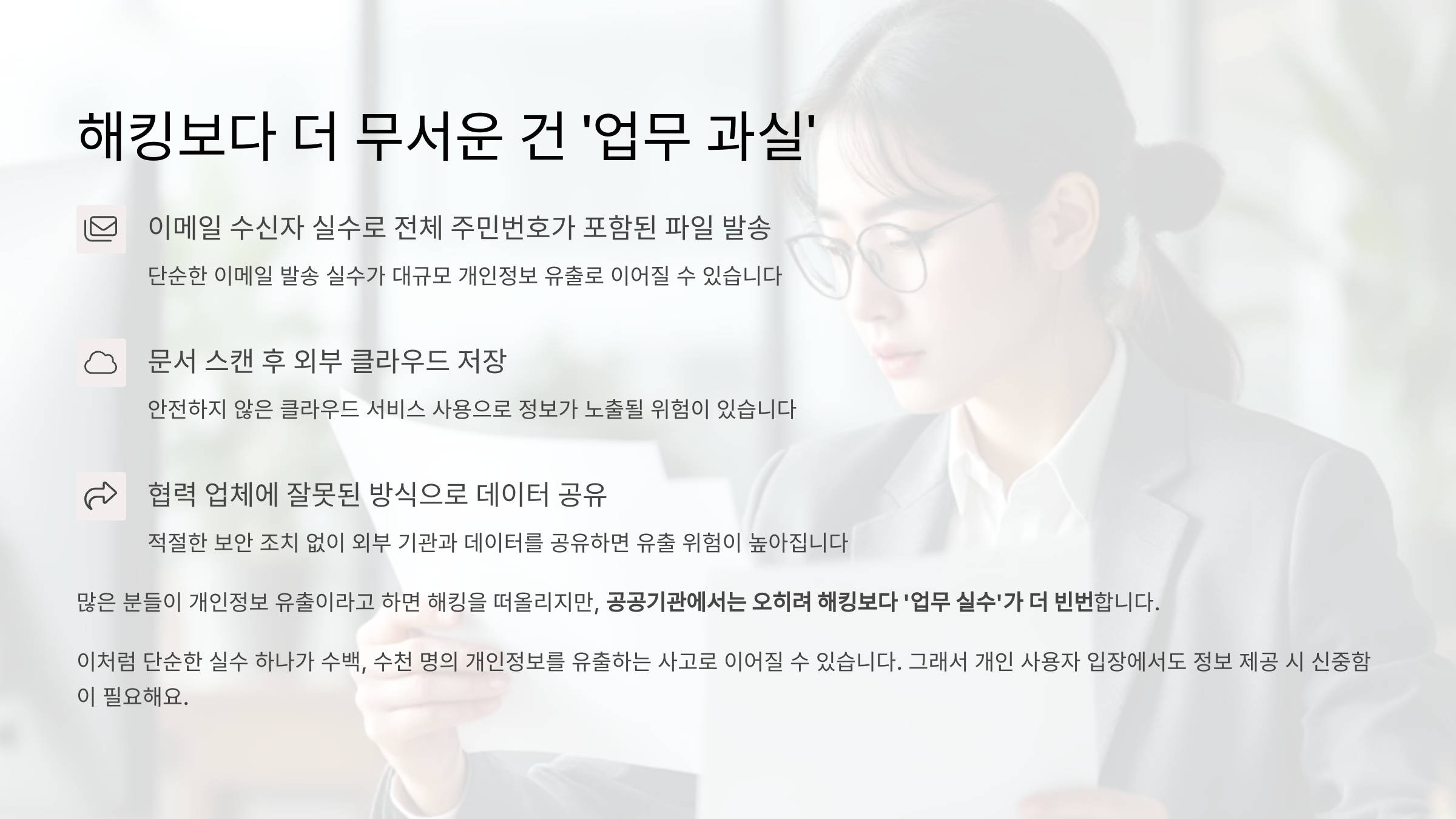 많은 분들이 개인정보 유출이라고 하면 해킹을 떠올리지만, 공공기관에서는 오히려 해킹보다 ‘업무 실수’가 더 빈번합니다.