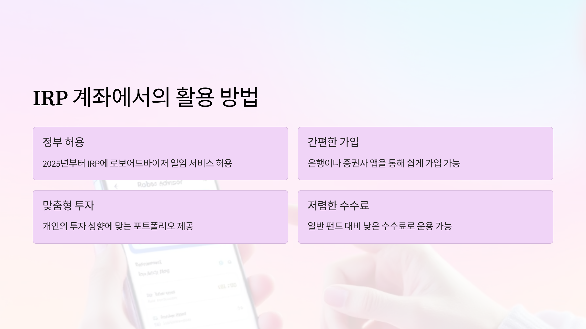 정부는 2025년부터 개인형 퇴직연금(IRP)에 로보어드바이저 일임 서비스를 허용하였습니다. 이를 통해 투자자는 다음과 같은 혜택을 누릴 수 있습니다:
