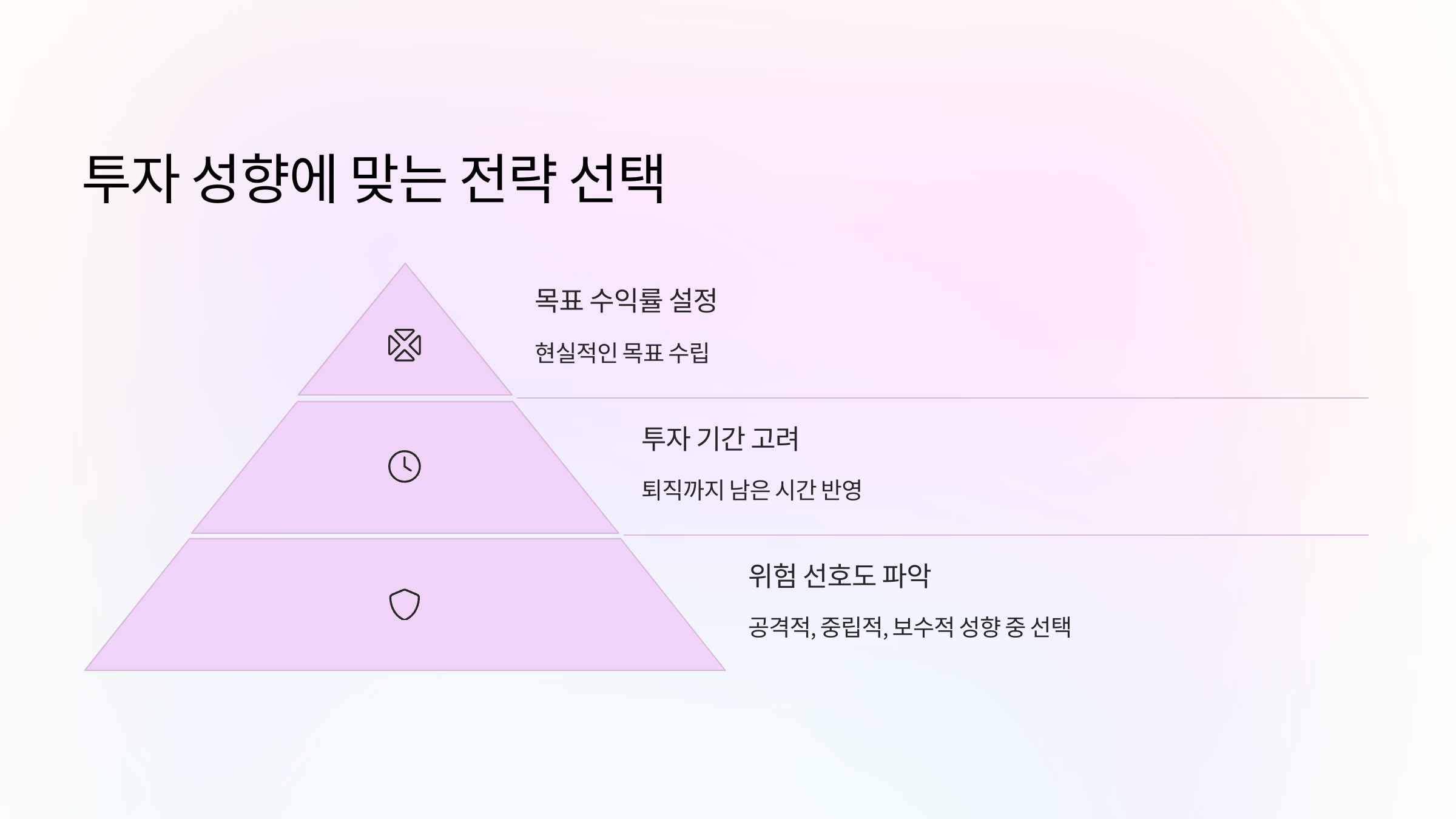 - 투자 기간: 퇴직까지 남은 기간에 따라 전략 조정