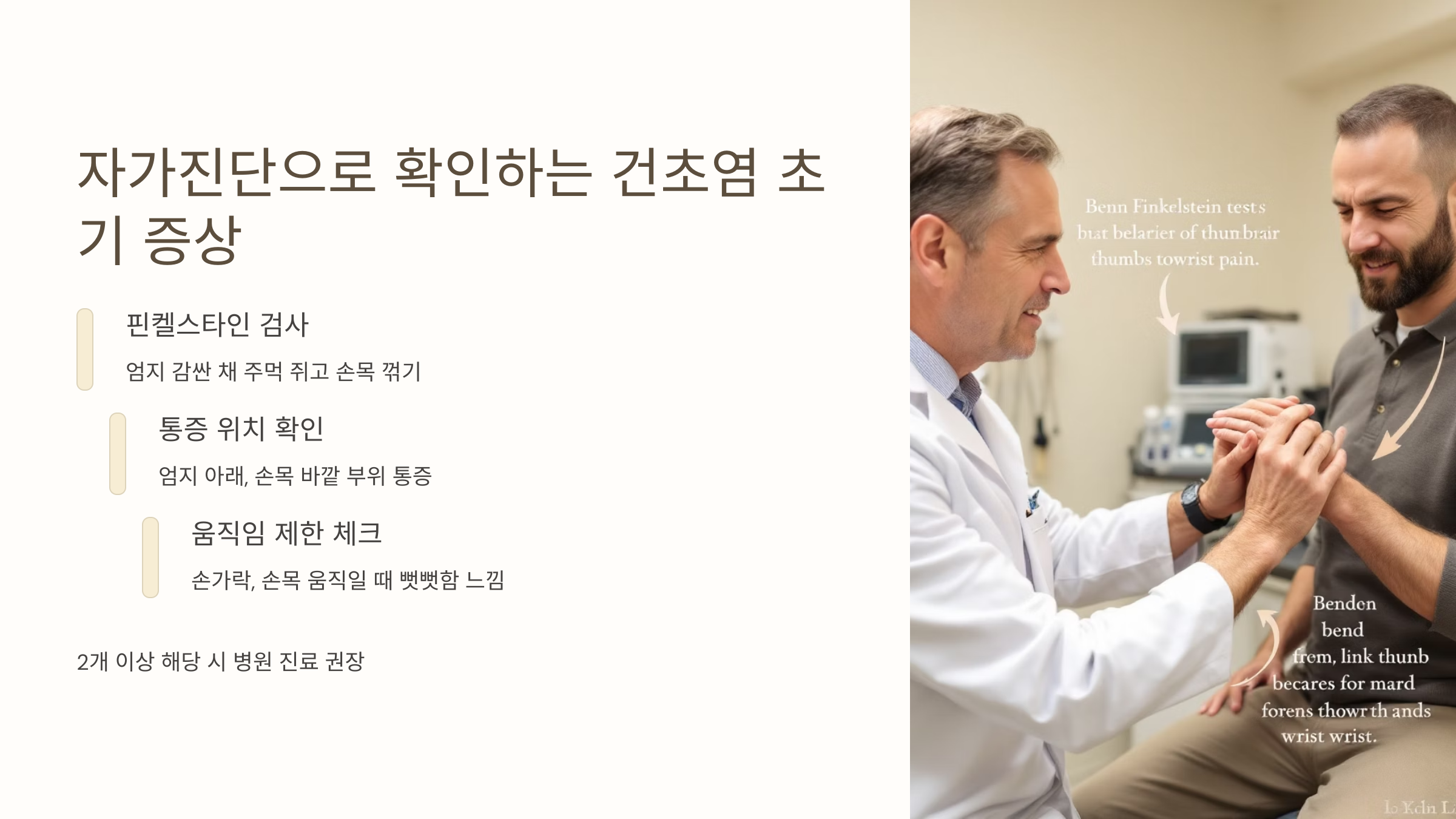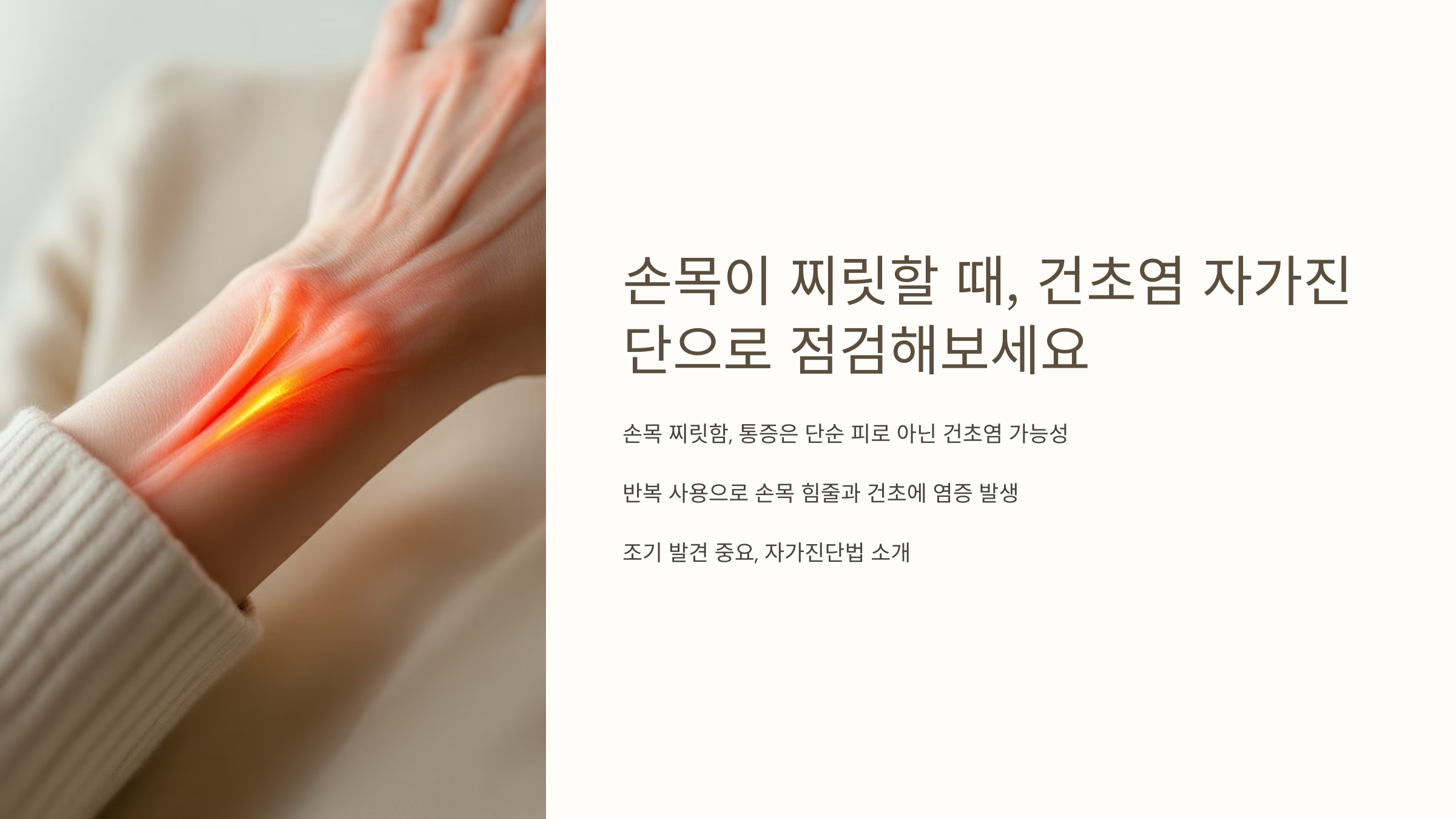 건초염은 자가진단만으로도 어느 정도 위험 신호를 감지할 수 있어요. 찌릿한 통증이 느껴질 때는 꼭 핀켈스타인 검사를 해보시고, 가볍게라도 조치를 취하는 게 중요해요. 손목은 한 번 손상되면 회복에 시간이 오래 걸리기 때문에, 예방이 가장 좋은 치료입니다. 오늘부터라도 손목에게 쉼을 주세요! 🙏