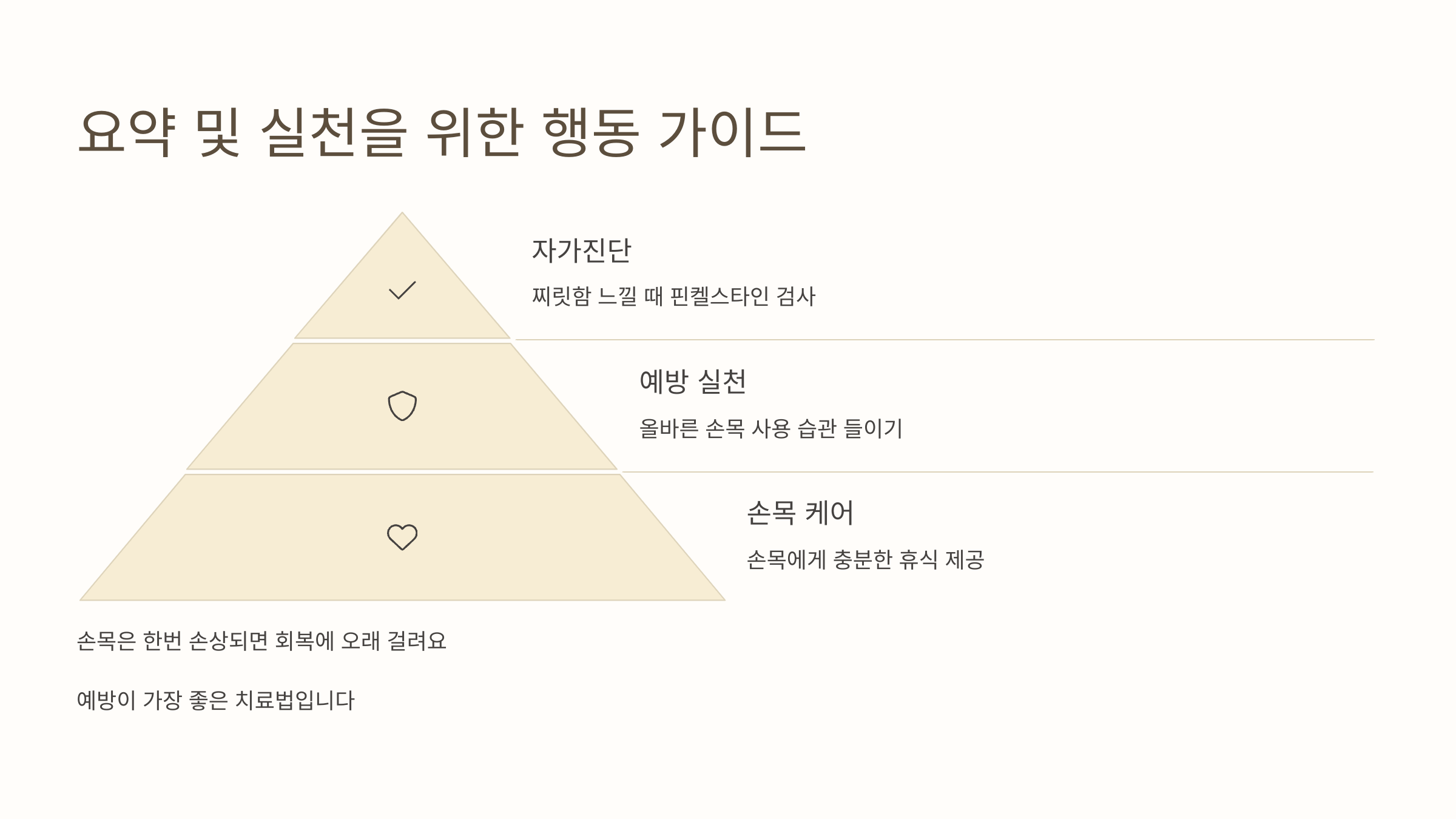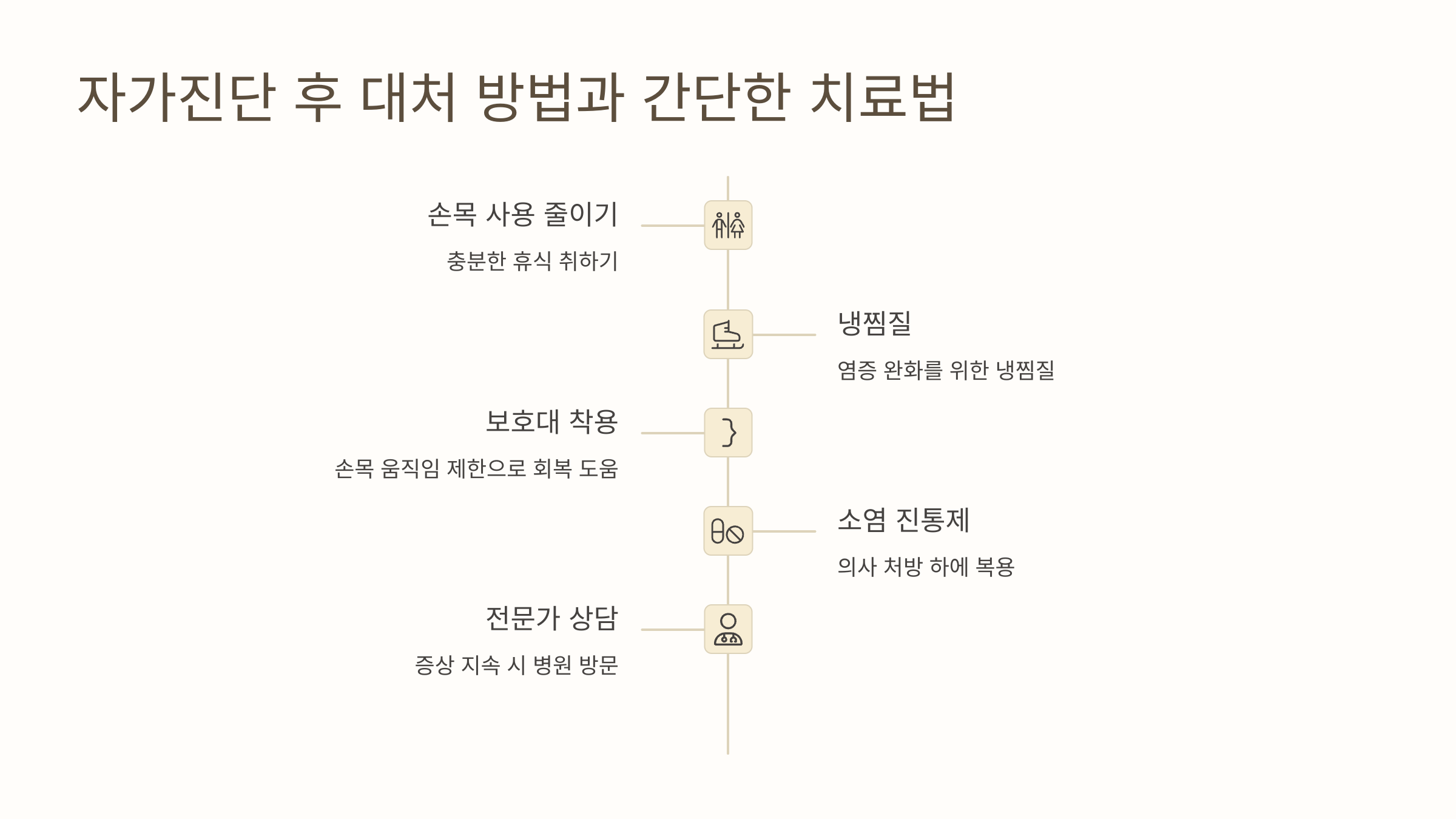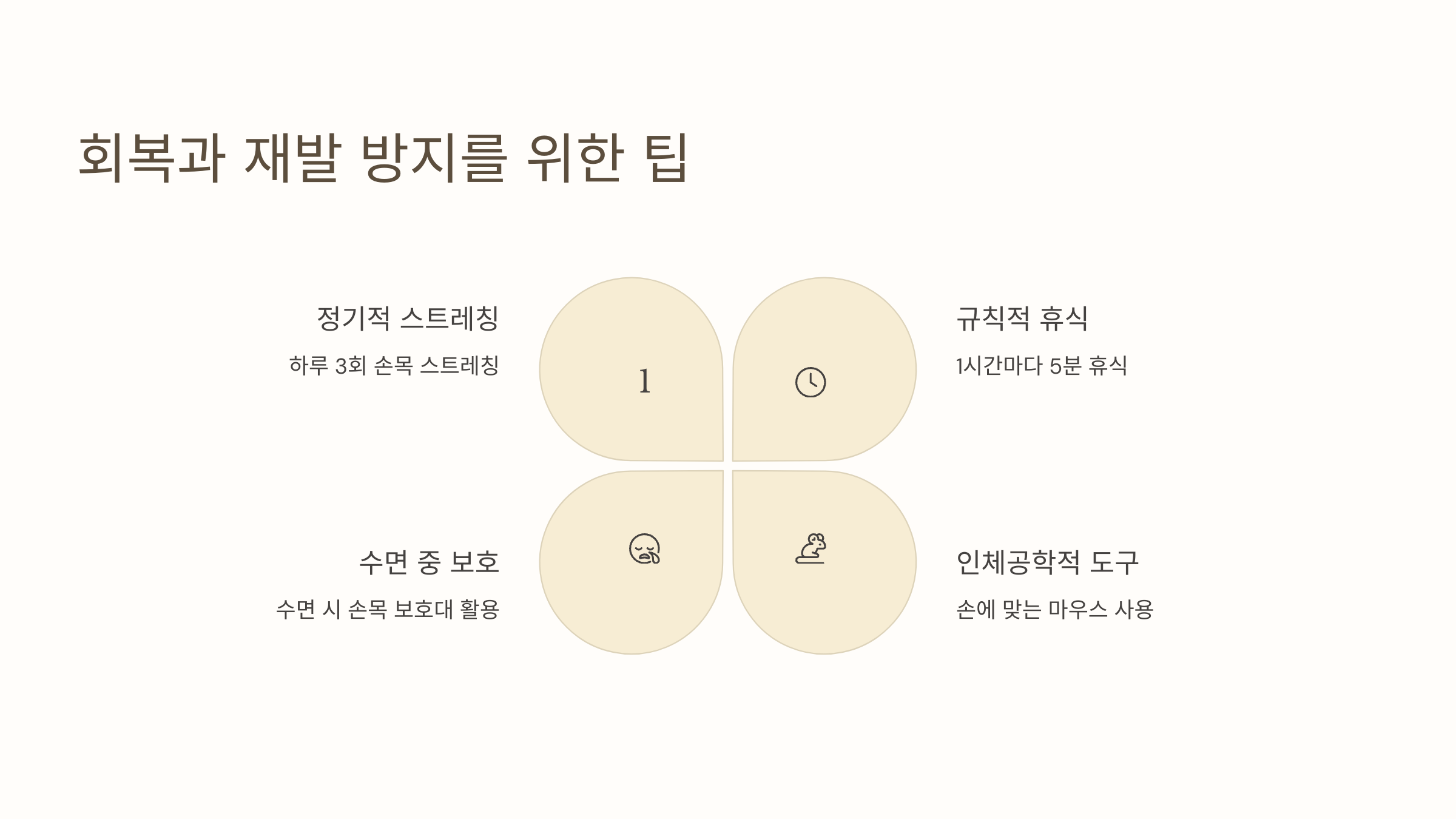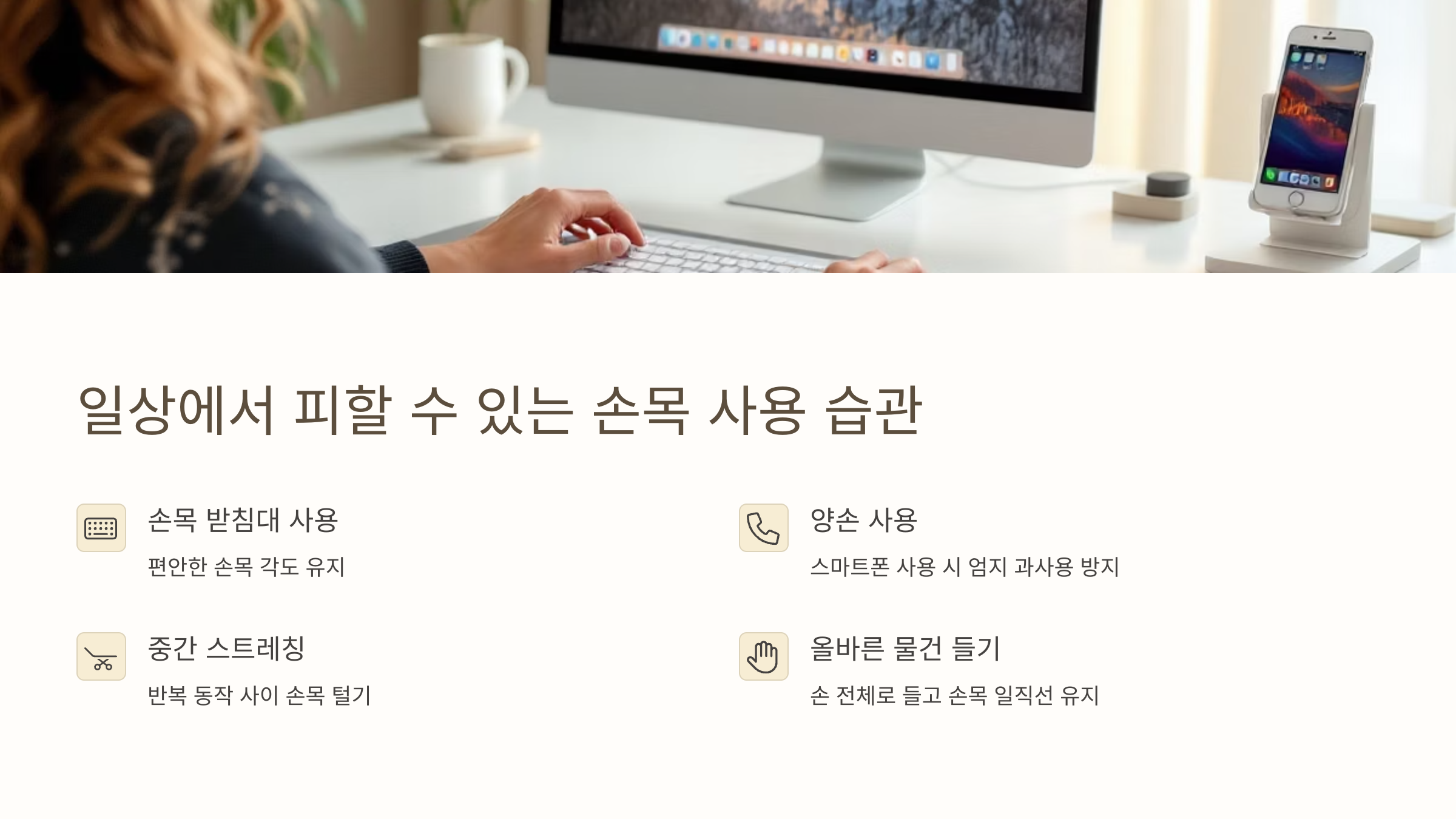 - 손목 사용 줄이기: 사용을 줄이고 쉬는 것이 가장 먼저입니다.
