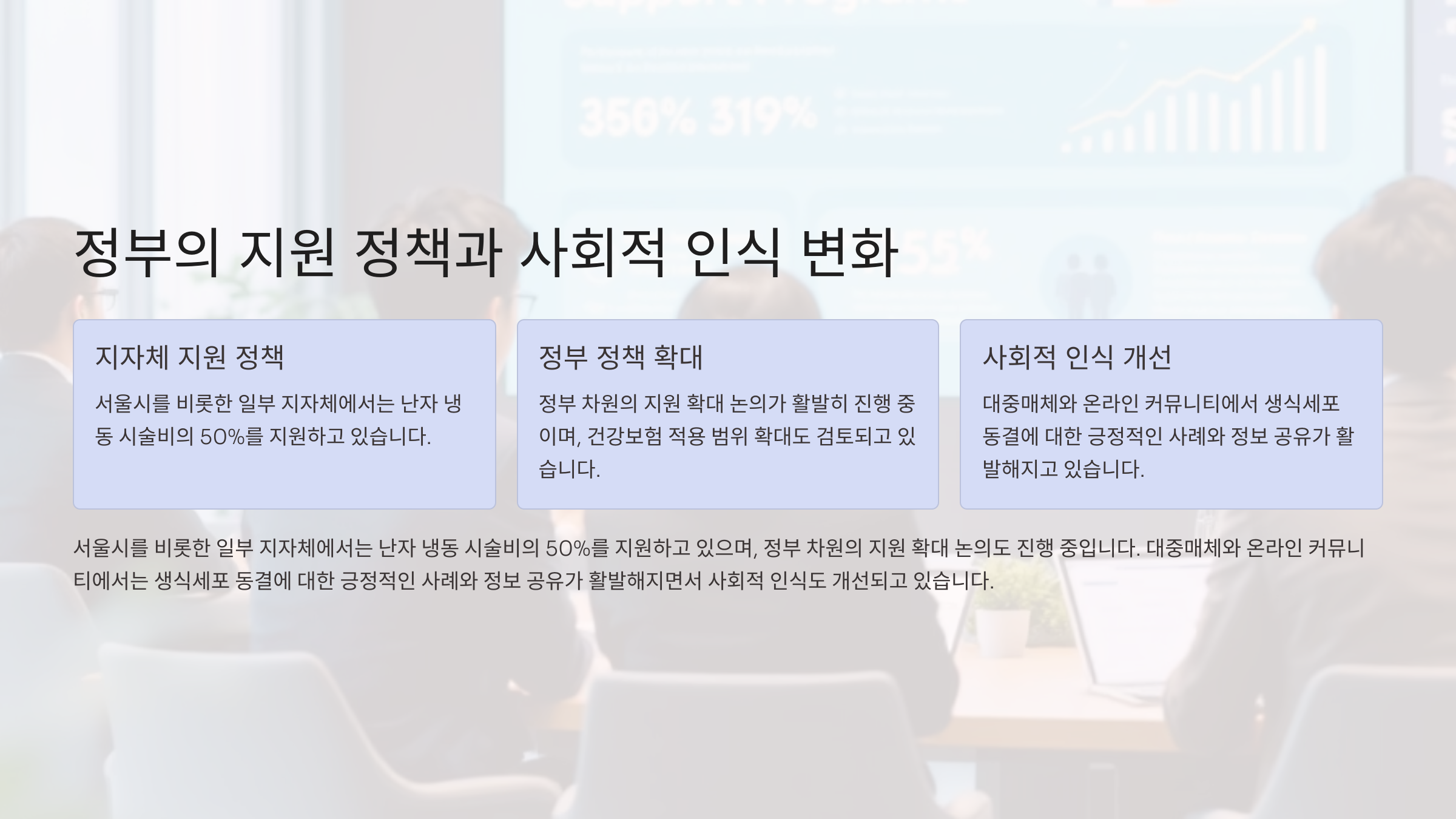 서울시를 비롯한 일부 지자체에서는 난자 냉동 시술비의 50%를 지원하고 있으며, 정부 차원의 지원 확대 논의도 진행 중입니다.