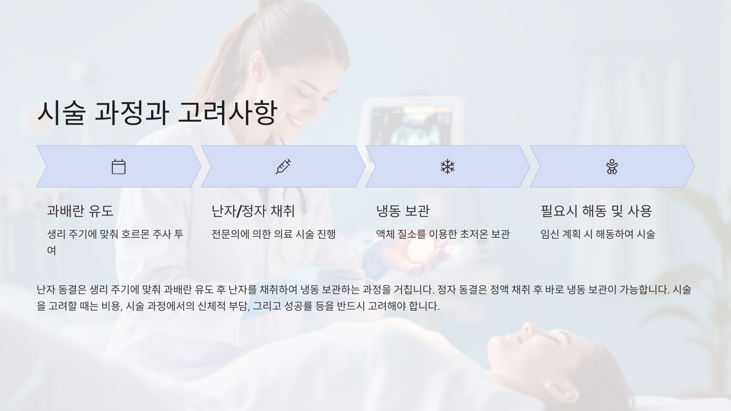 난자 동결: 생리 주기에 맞춰 과배란 유도 → 난자 채취 → 냉동 보관
