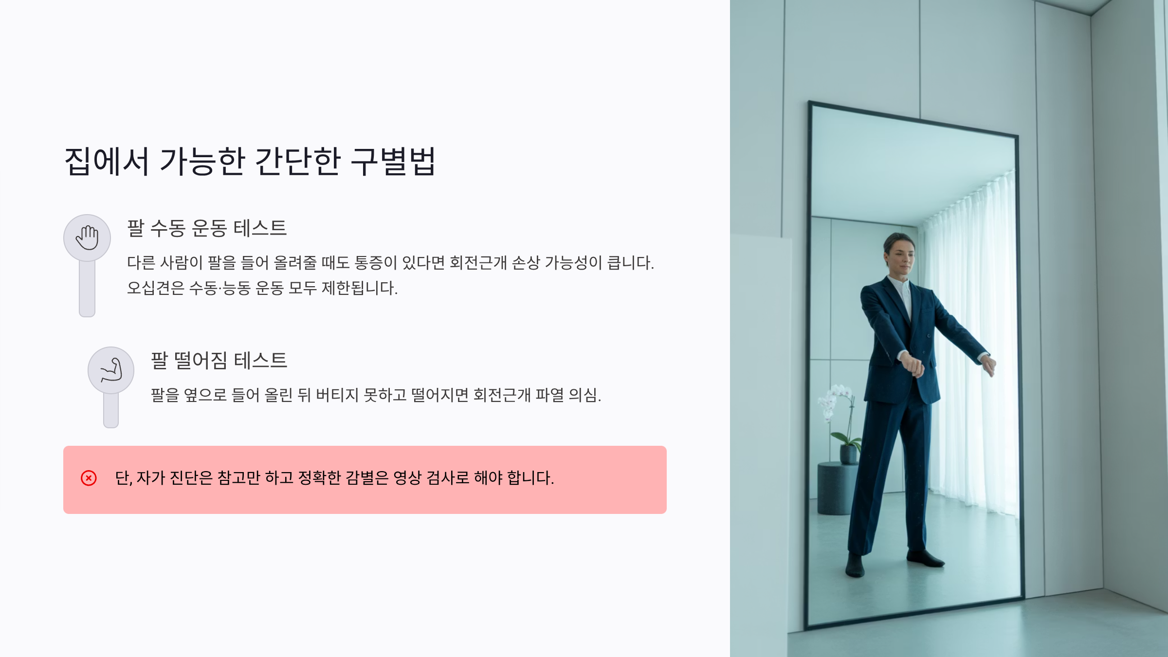 - 팔 떨어짐 테스트: 팔을 옆으로 들어 올린 뒤 버티지 못하고 떨어지면 회전근개 파열 의심.