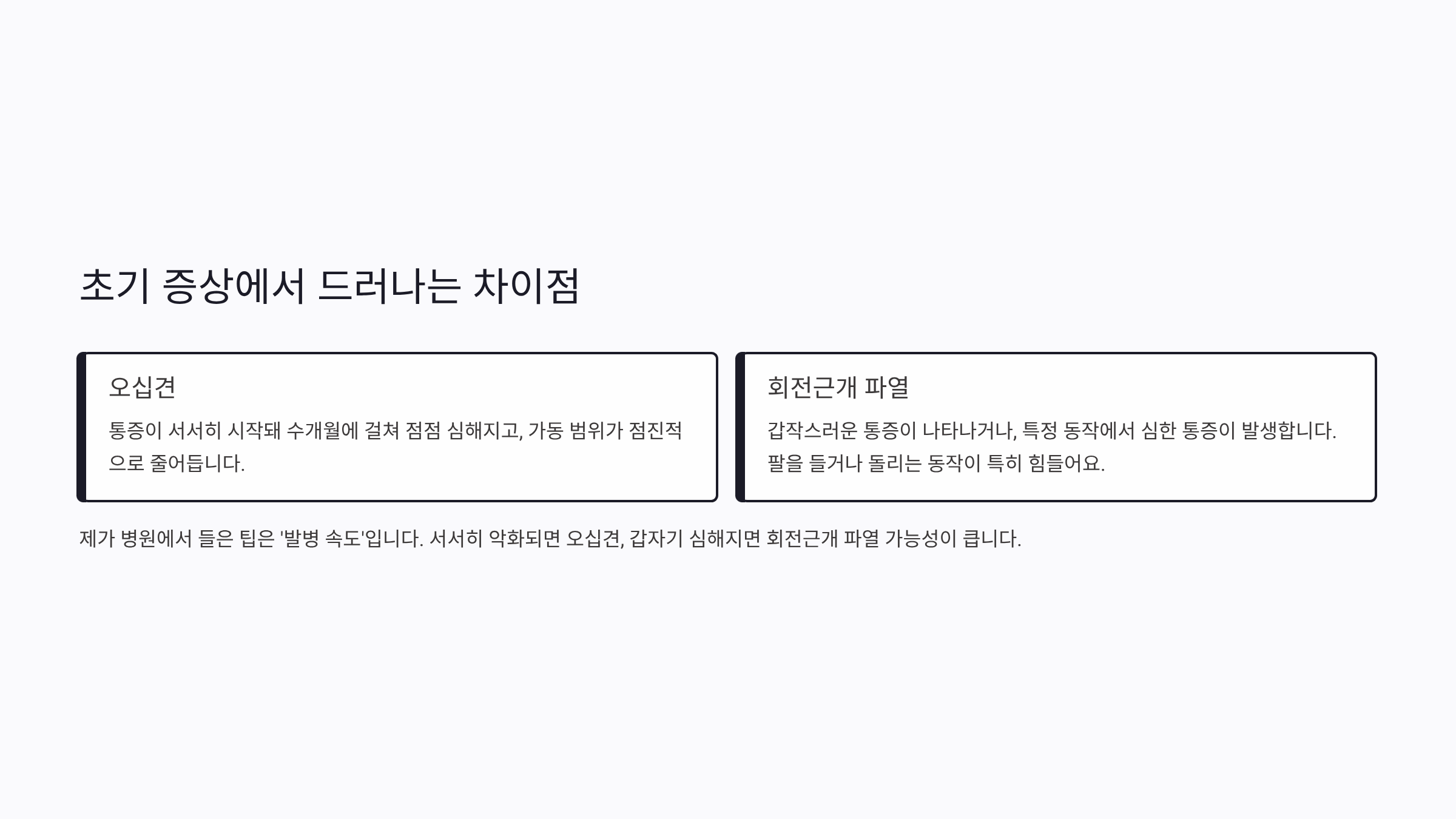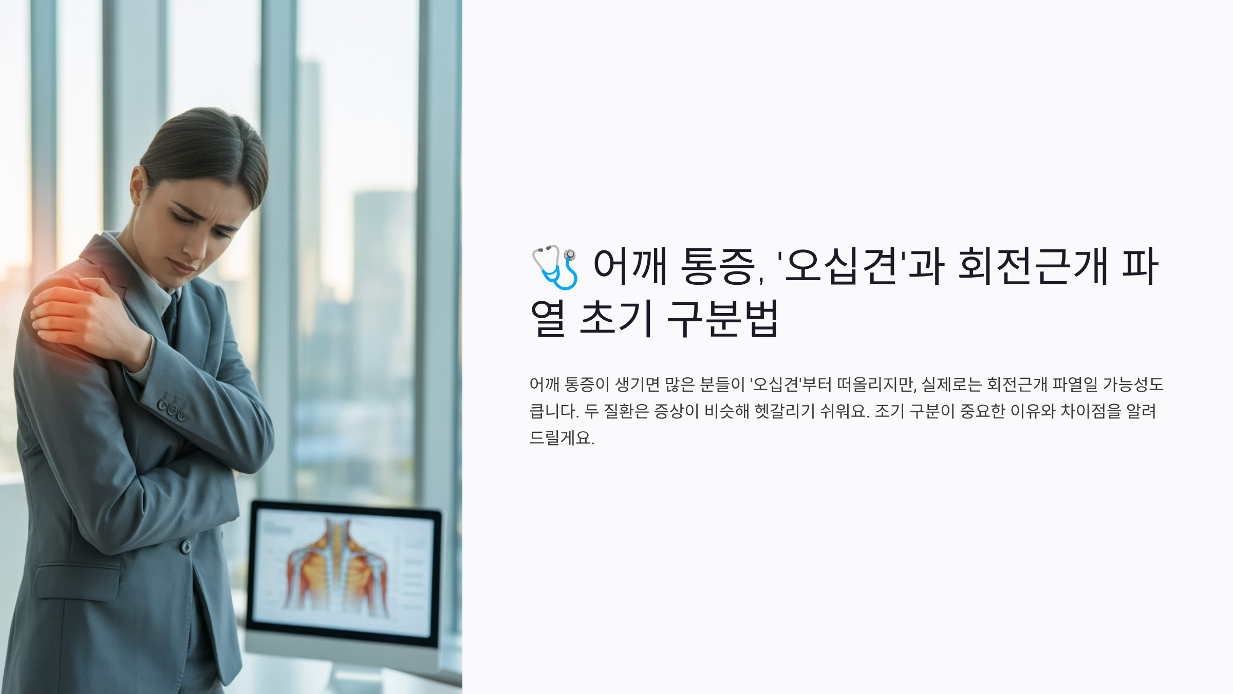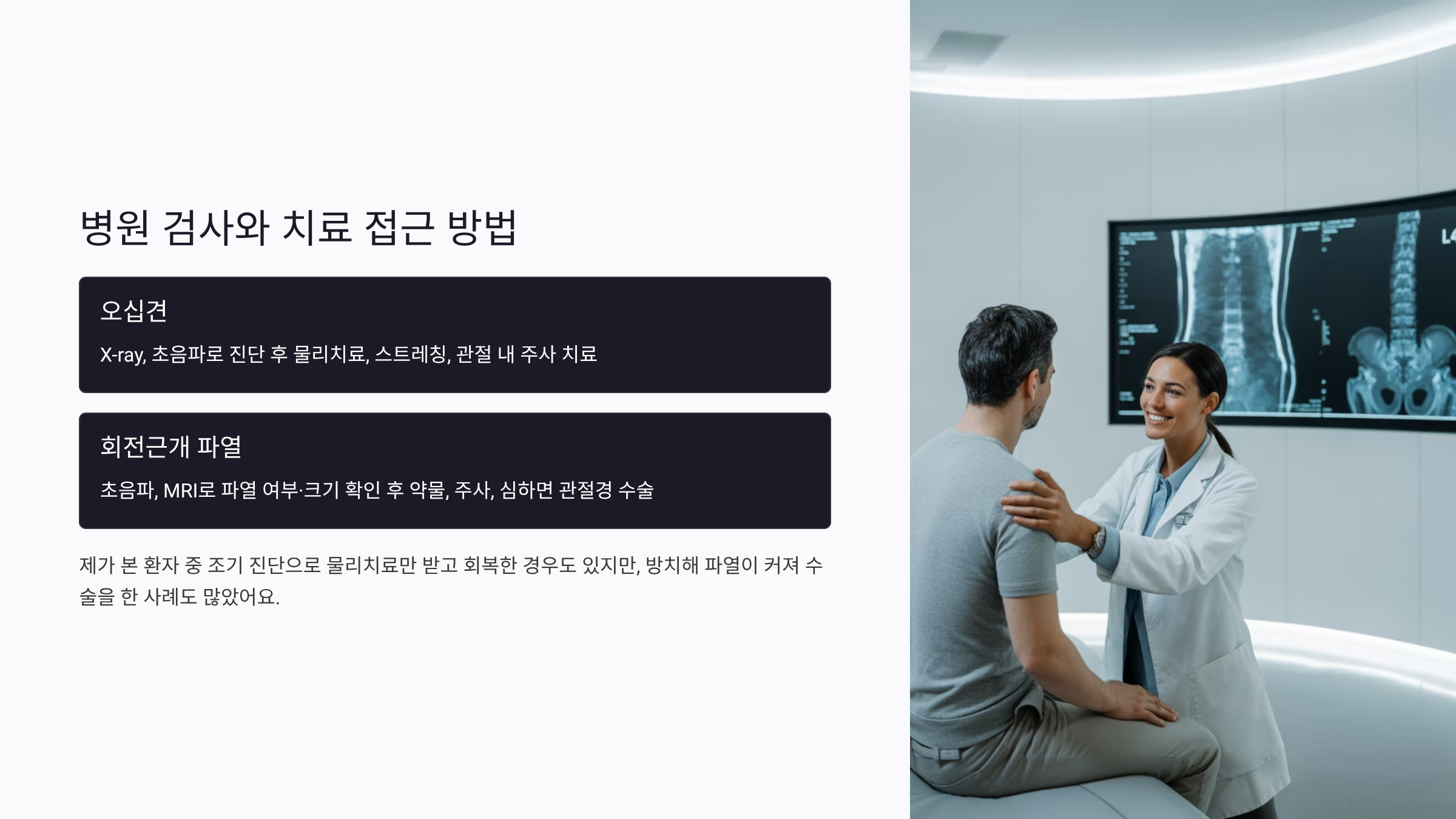제가 병원에서 들은 팁은 ‘발병 속도’입니다. 서서히 악화되면 오십견, 갑자기 심해지면 회전근개 파열 가능성이 큽니다.